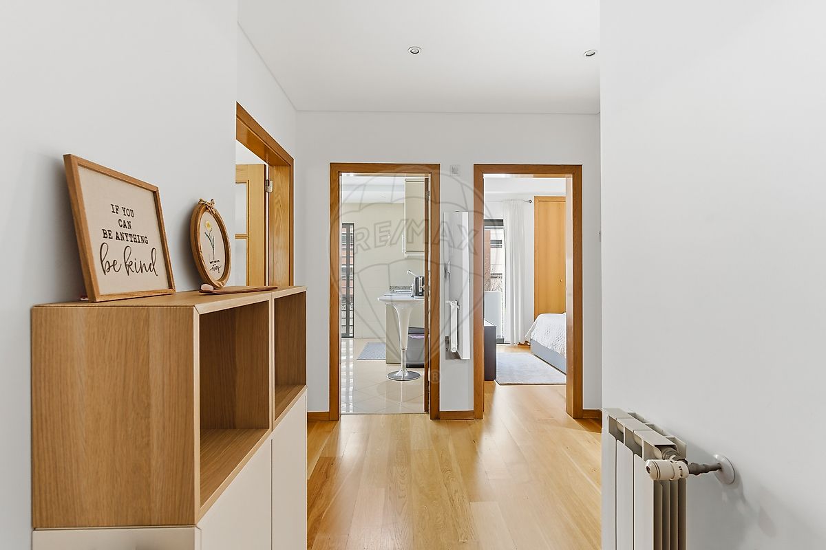Inserido num prédio de 2005, com elevador, este imóvel dispõe de 1 lugar de parqueamento em garagem e acesso a pátio comum e jardim do condomínio.