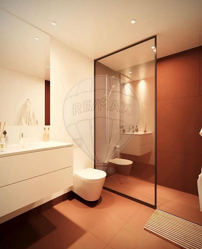 As casas de banho evidenciam um estilo moderno e prático, com loiças suspensas tipo Sanitana, móveis com lavatório integrado tipo Sanindusa, bases de duche planas com resguardo em vidro e torneiras eficientes tipo Bruma, privilegiando conforto e eficiência hídrica.