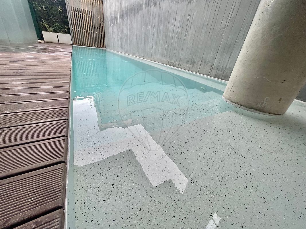 Inserido num edifício moderno (ano 2000), com elevador, o condomínio distingue-se ainda pela existência de uma piscina privativa para uso exclusivo dos residentes — um elemento raro e extremamente valorizado no centro histórico da cidade.