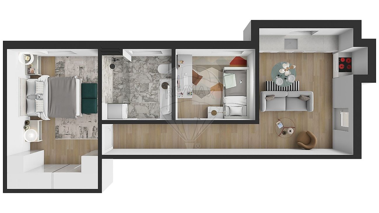 Apartamento de tipologia T1+1 composto por sala, em open-Space, quarto com closet, casa de banho e escritório, que poderá ser transformado em quarto.