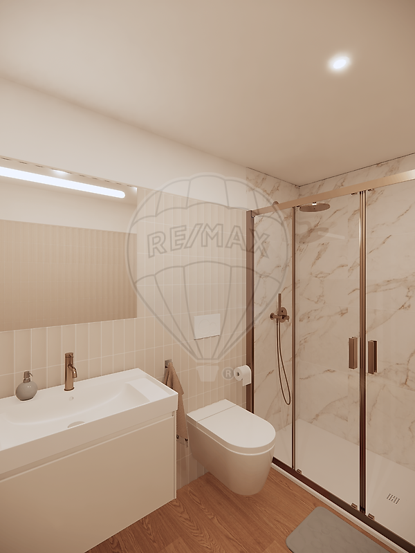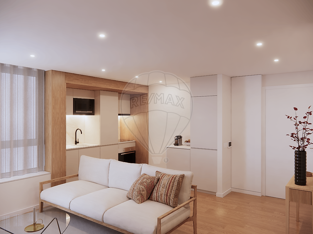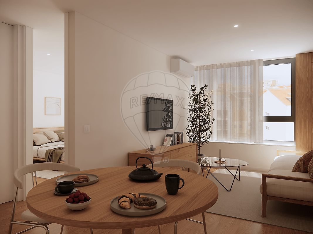 A fração apresenta uma área aproximada de 63m², com uma organização funcional e equilibrada dos espaços, composta por sala e cozinha em open space, 1 quarto e duas casas de banho. A distribuição privilegia a luminosidade natural e o conforto do dia a dia, com interiores modernos, linhas contemporâneas e materiais de gama média/alta, conforme o dossier de acabamentos.