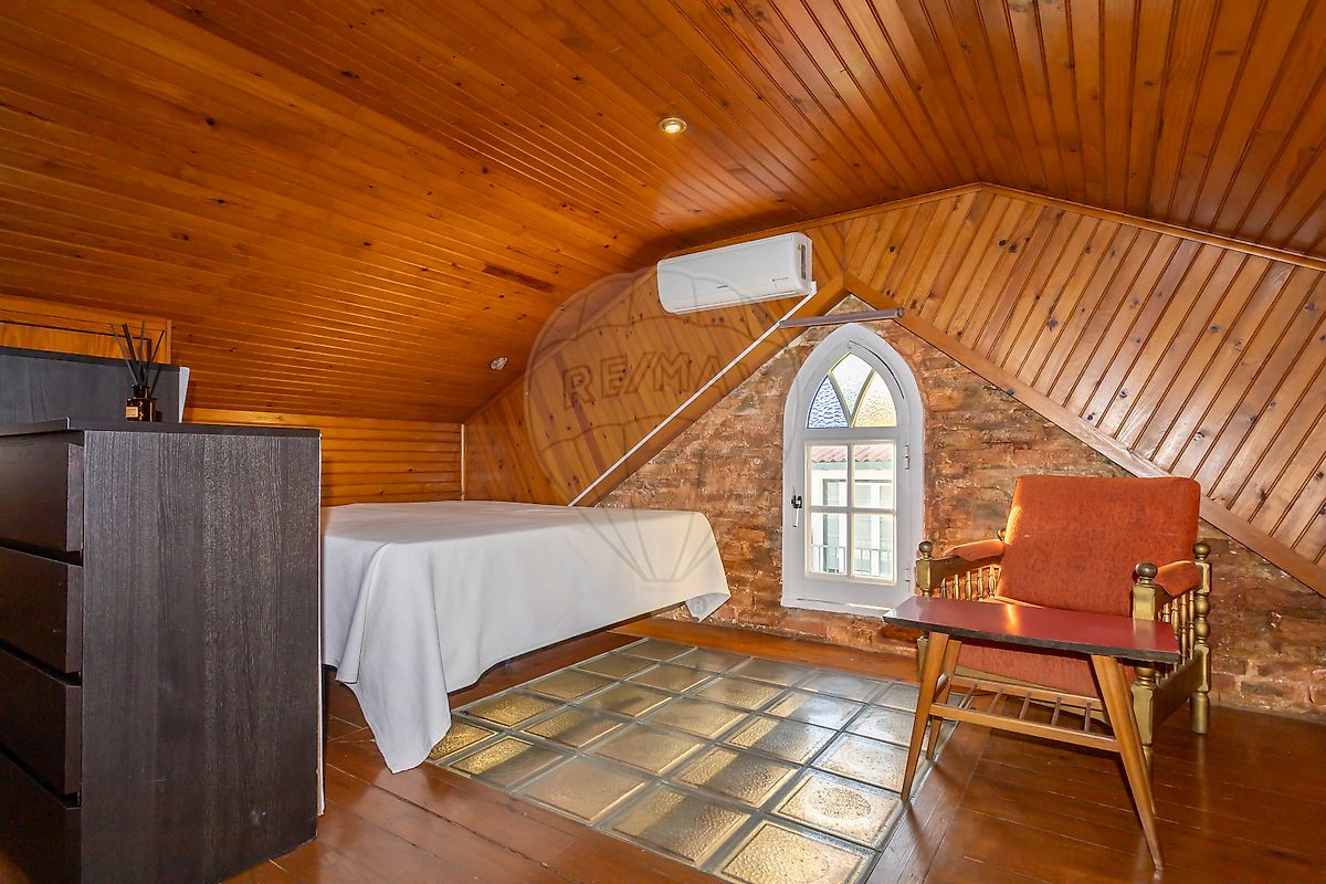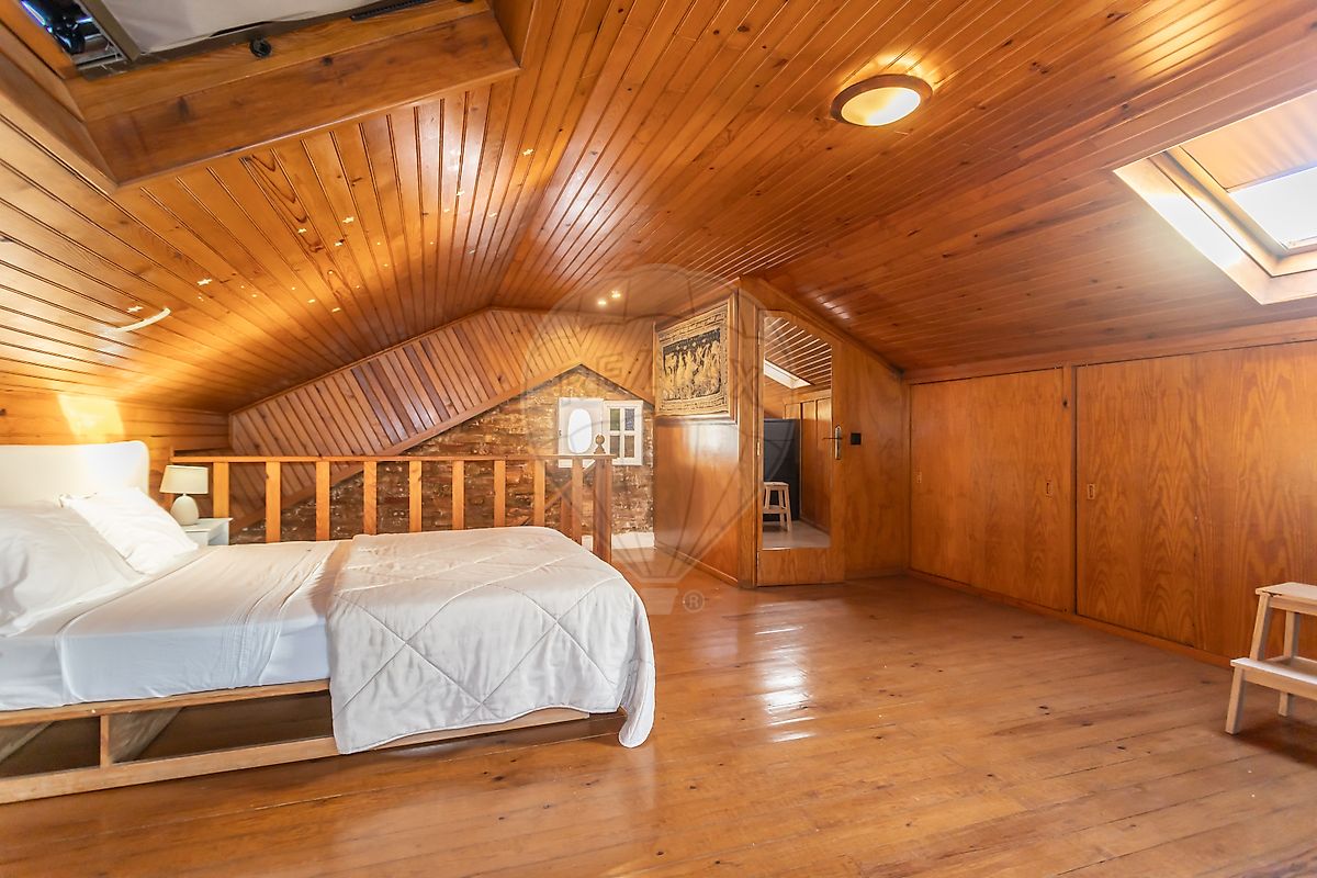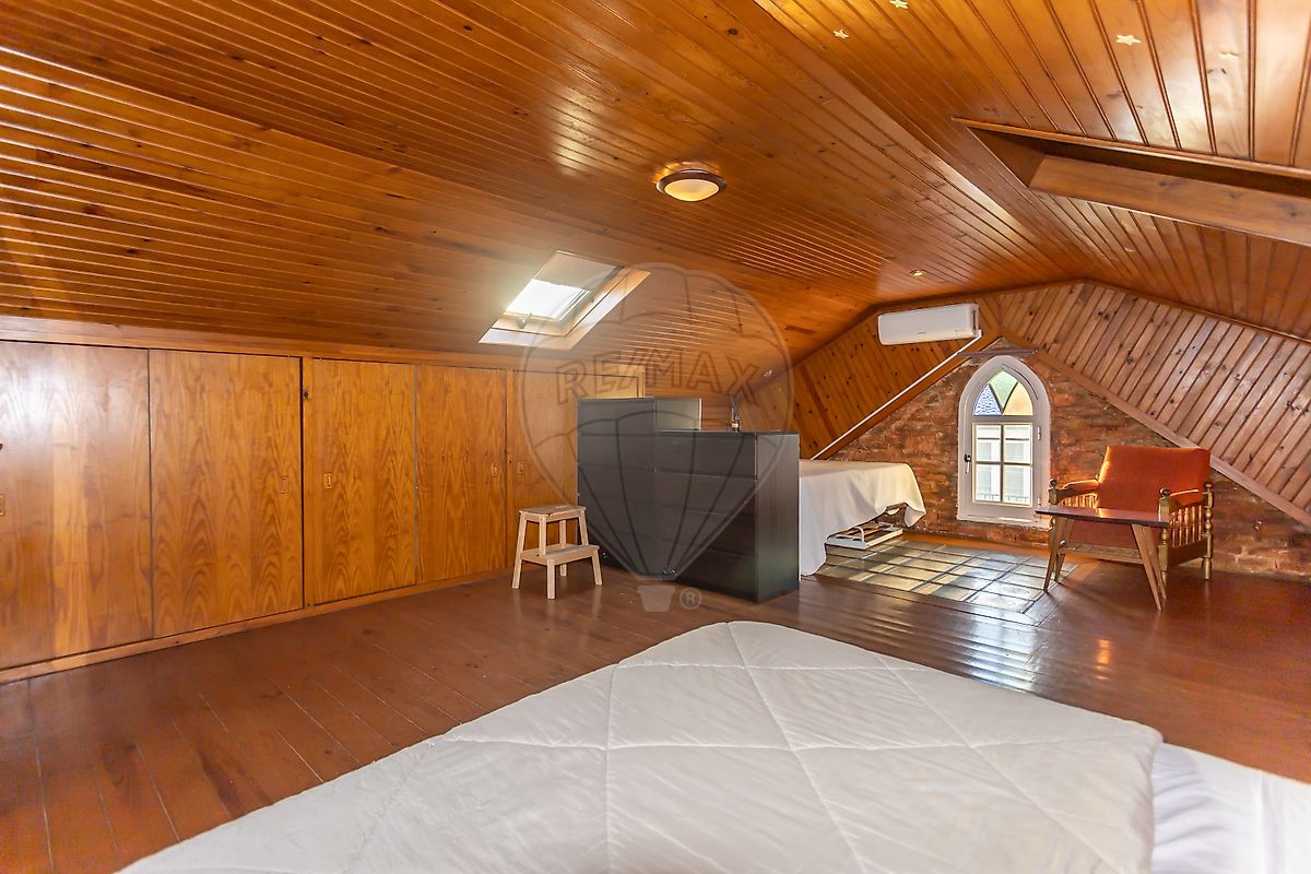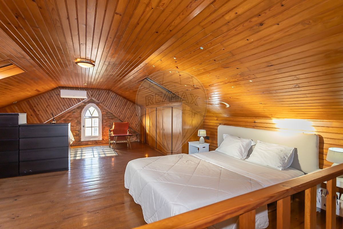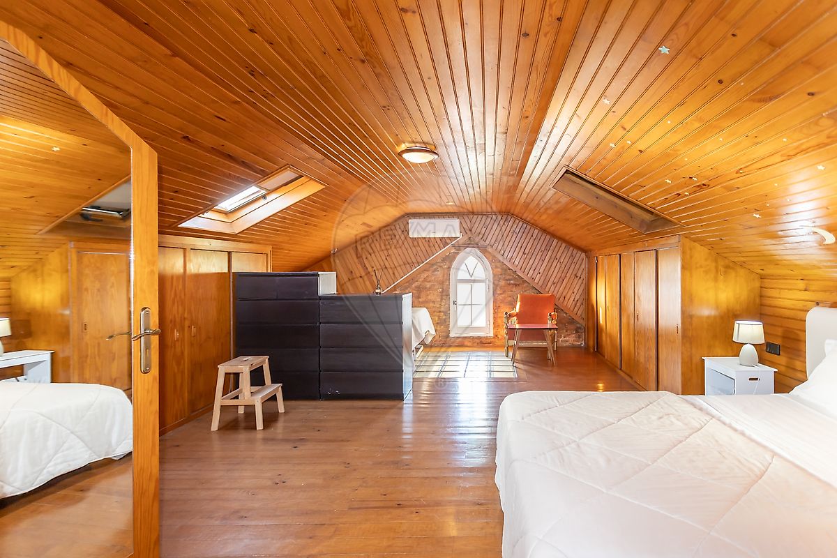 No sotão grande quarto com ar condicionado, casa de banho com base de duche e muita arrumação.