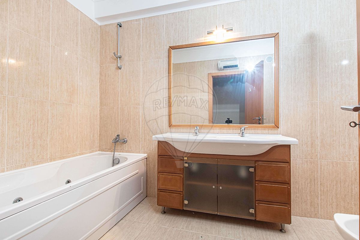 Na sala bastante ampla e muito luminosa, através da dupla janela panorâmica em conformidade com os quartos e as suas vistas desafogadas, um deles em Suite com roupeiro embutido, o apartamento todo equipado com estores elétricos, música ambiente e ar condicionado, tem duas casas de banho uma com banheira outra com base de duche.