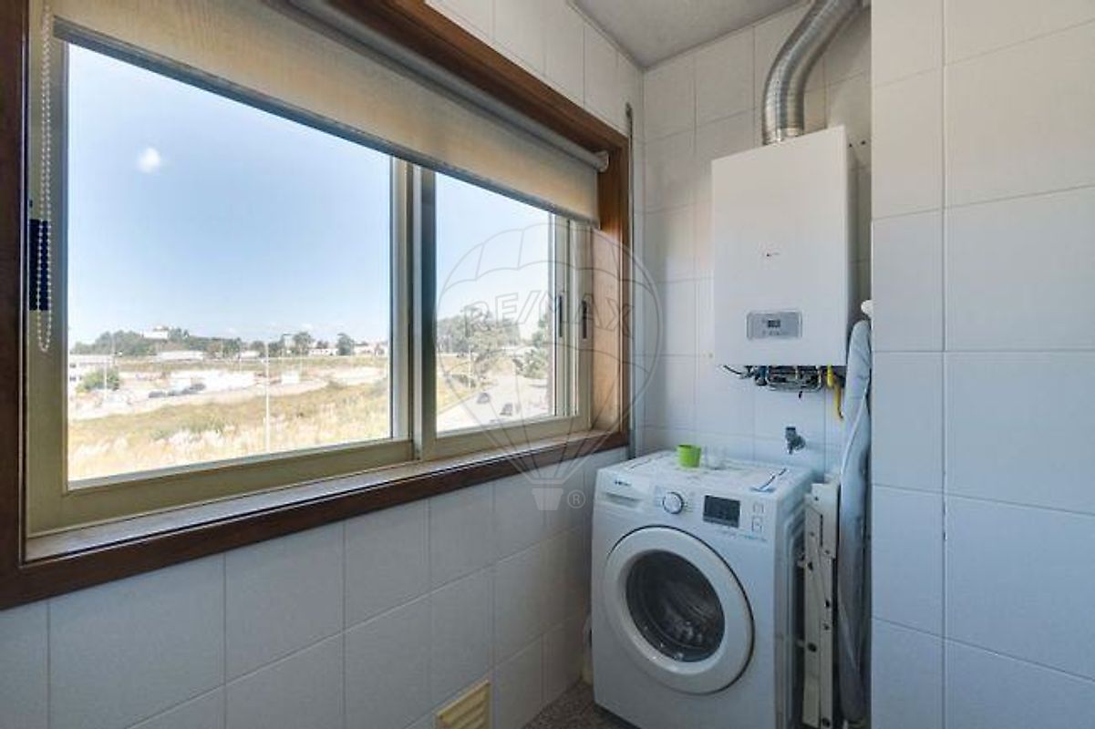 Lavandaria ,armário para arrumos diversos, com caldeira, máquina de lavar roupa, aspirador e caixilharia dupla.