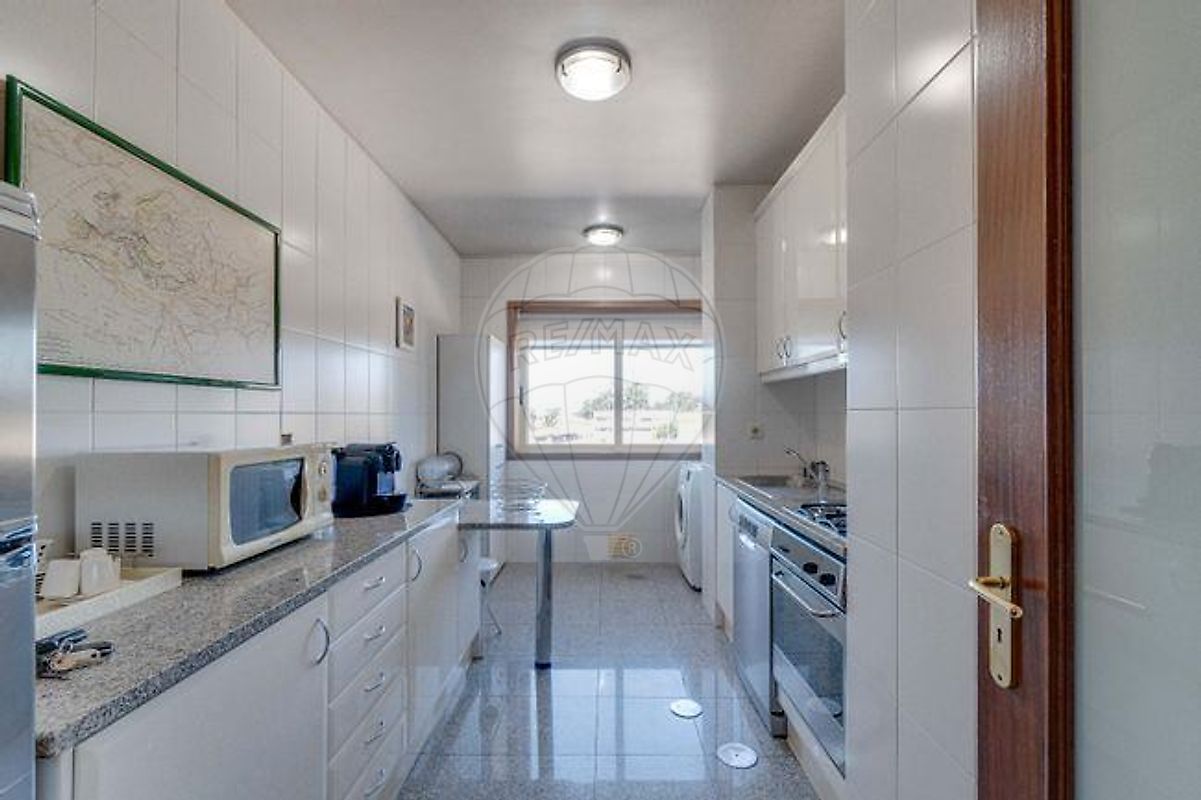 Cozinha equipada com todas as louças inerentes, exaustor, plca, forno, combinado, máquina de lavar louça, máquina de café e liquificador, caixilharia dupla.