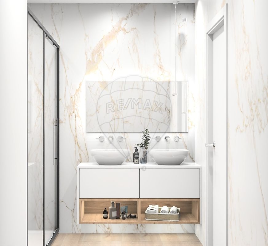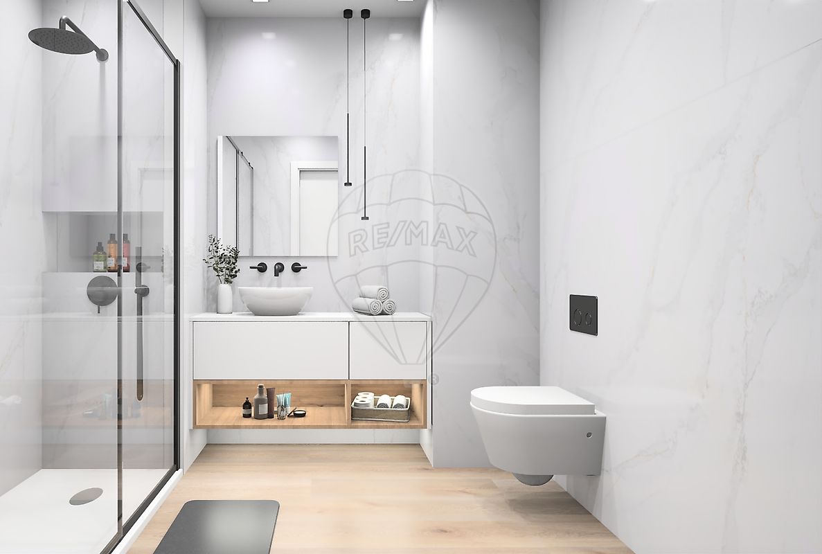 A casa-de-banho social (5,30 m2) com base de duche e é de excelente acesso às zonas comuns e a casa-de-banho do quarto principal (4,00m2) é dotada de banheira.