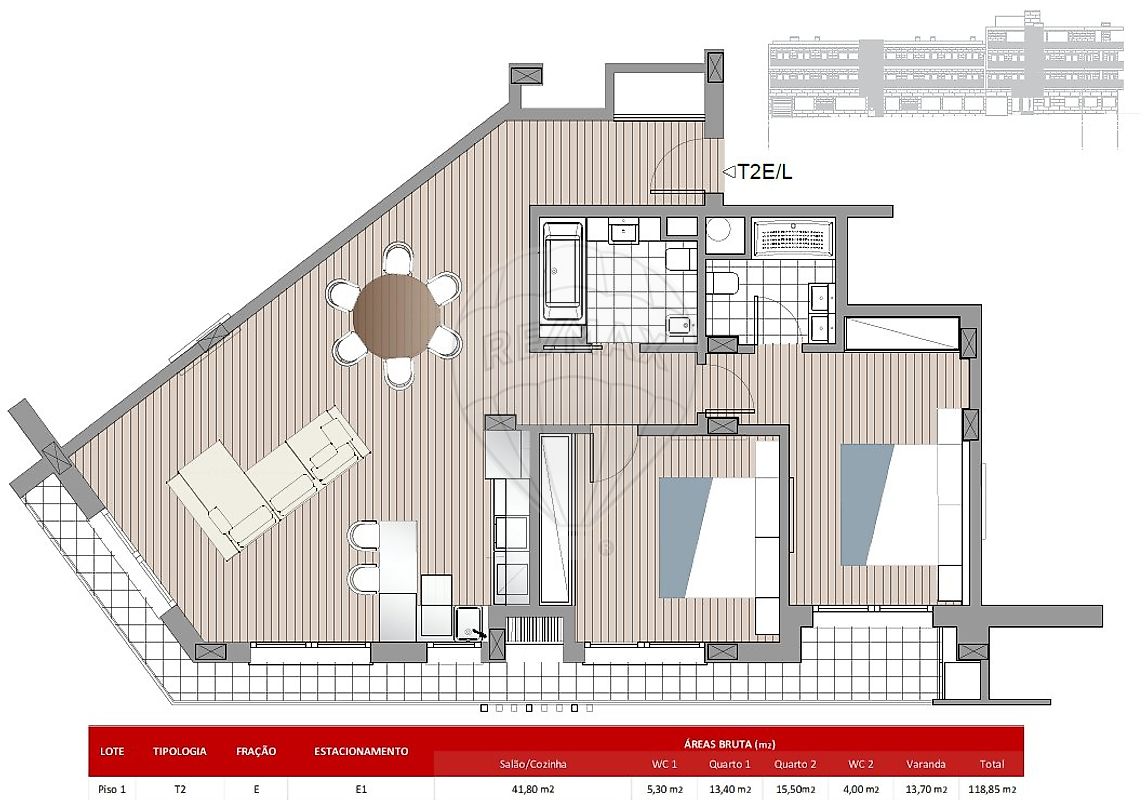 Ao nível do 1.º piso (frente) do empreendimento, encontra um fantástico apartamento de tipologiaT2 com uma área de 117,40 m2, sendo 13,7 m2 respeitantes a uma varanda destinada a lazer e estar. No espaço exterior da varanda encontra uma churrasqueira destinada a proporcionar maior qualidade de vida aos seus dias.