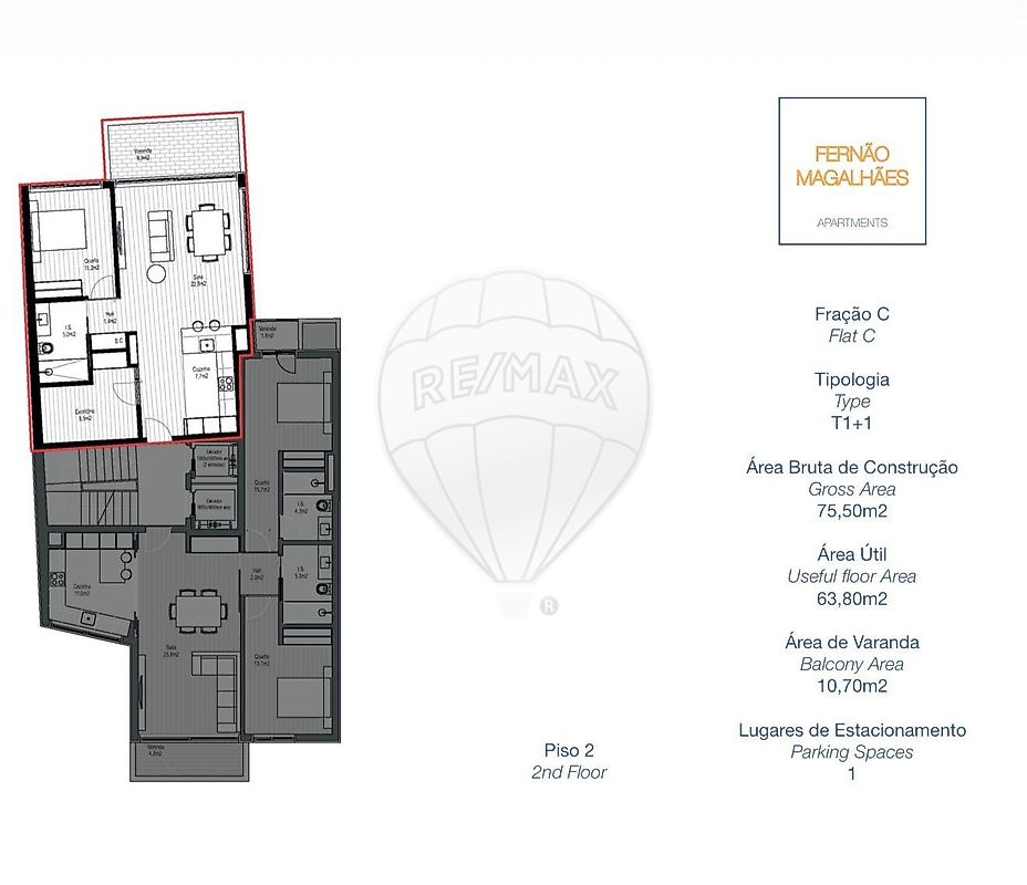Com uma área útil de 63,80 m², este apartamento distingue-se pela sua organização funcional e pelo excelente aproveitamento do espaço. Dispõe ainda de uma varanda com 10 m², ideal para momentos de lazer, beneficiando de exposição solar a Poente, o que garante ótima luminosidade natural ao final do dia.