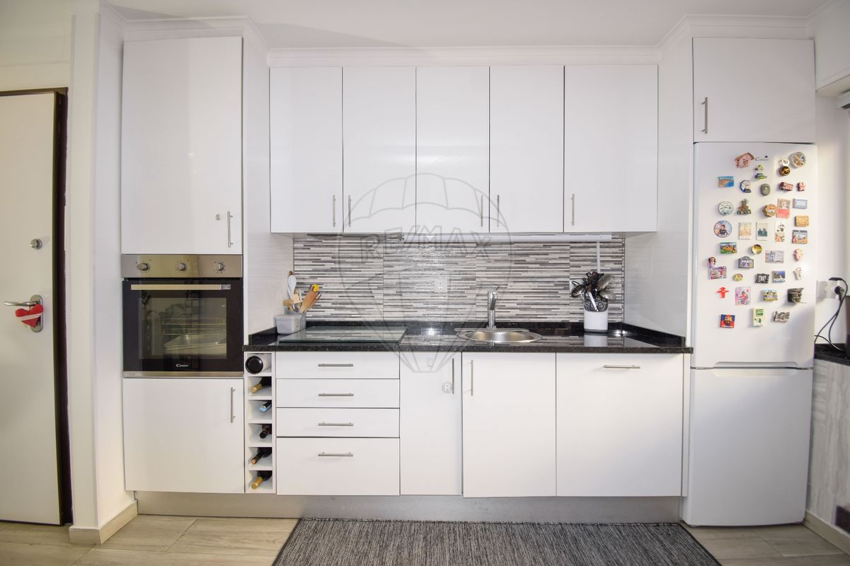 - Uma cozinha equipada com placa de indução, exaustor, termoacumulador, frigorífico, máquina de lavar a loiça e máquina de lavar a roupa.