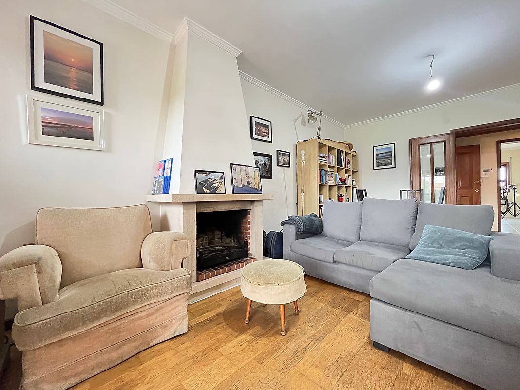 -Sala ampla com lareira e varanda, com luz natural;