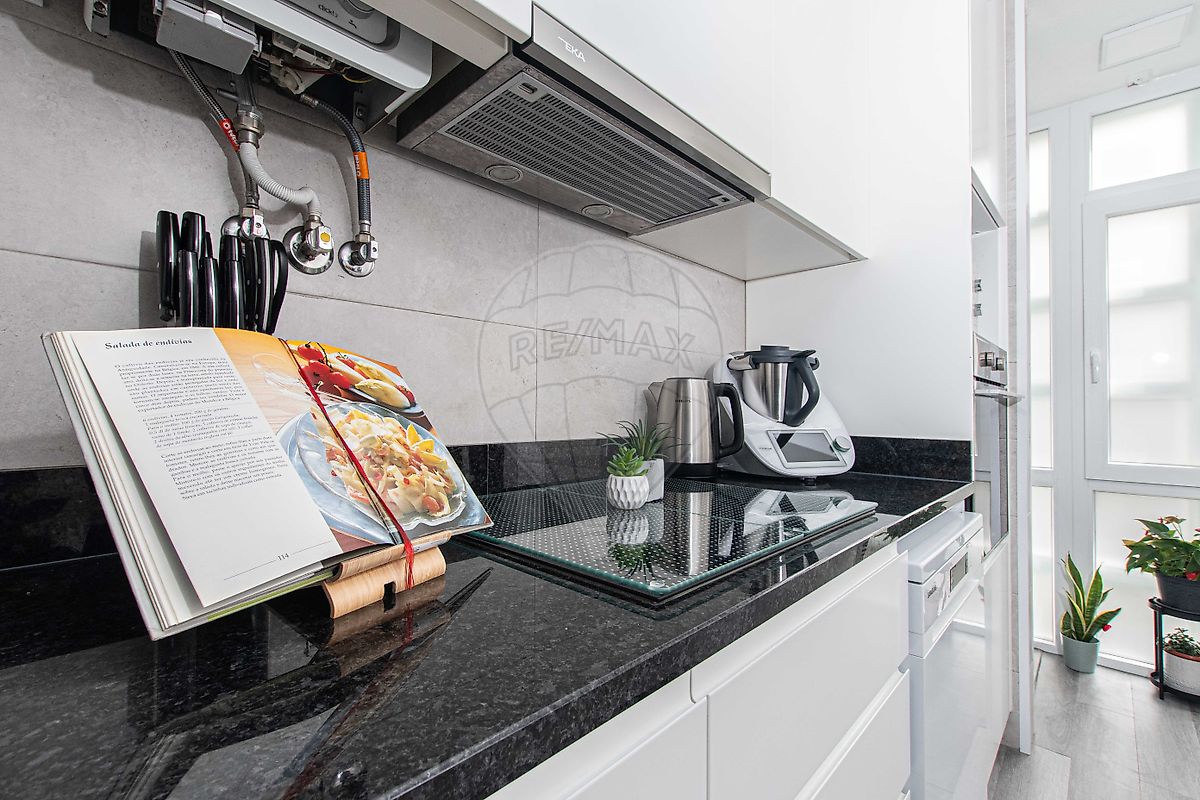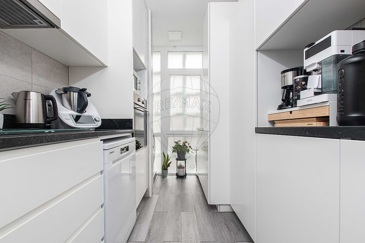 A cozinha, moderna e funcional, destaca-se pela organização e layout. Os móveis de linhas simples e os materiais atuais criam um espaço prático e agradável para o dia a dia, com ligação à zona de lavandaria.