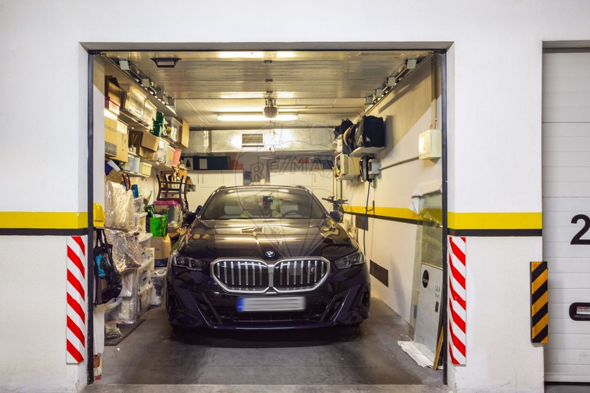 Garagem box para 1 carro, com espaço adicional de arrumação.