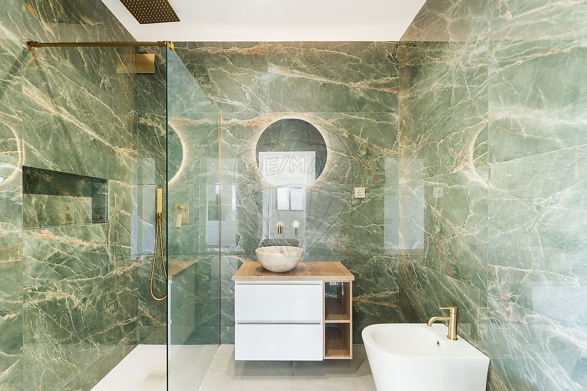 - instalação sanitária com base de duche, bidé, sanita e lavatório com móvel inferior