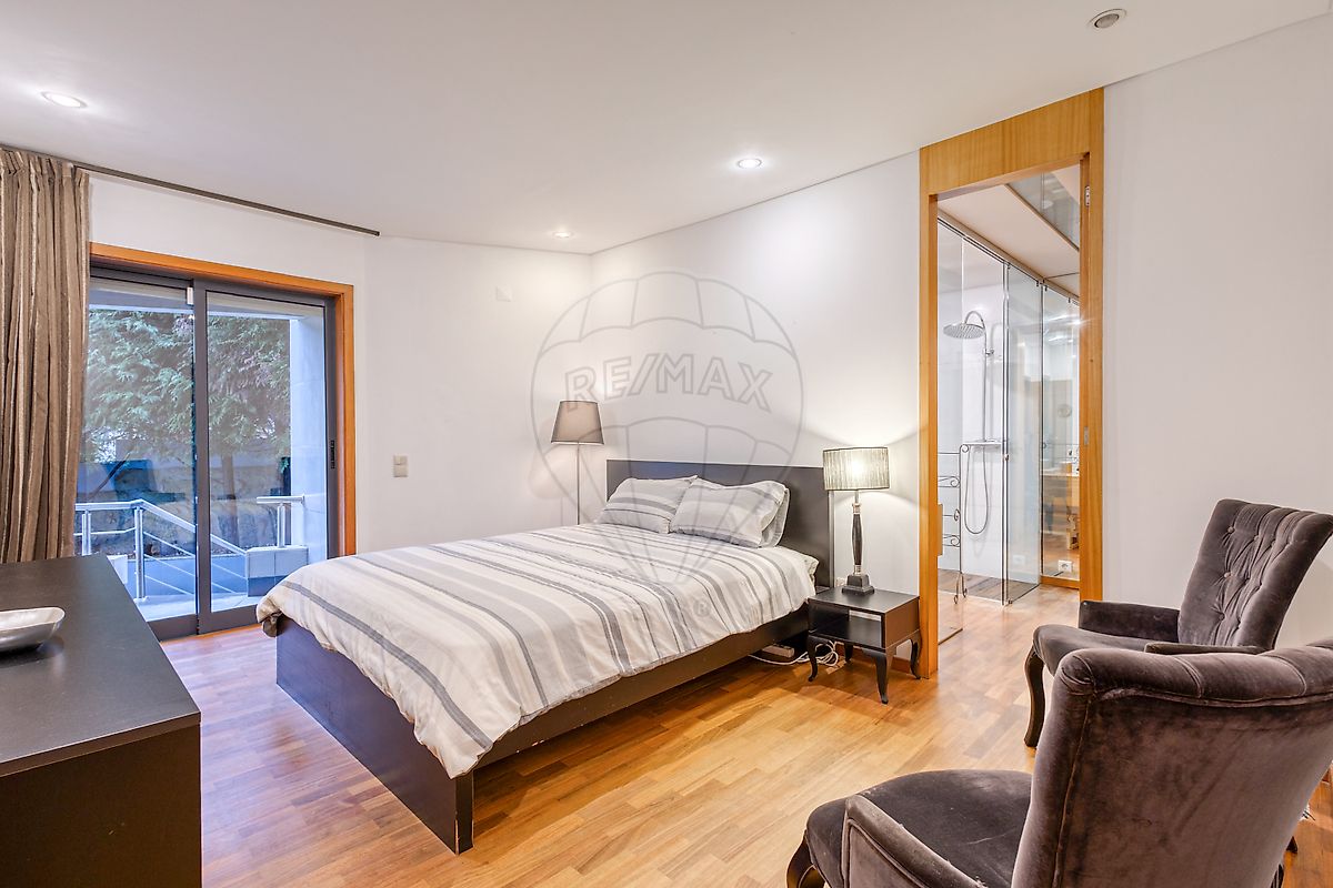 Dispõe de três quartos com armários embutidos e acesso direto ao jardim, sendo um deles uma suite com closet e acesso direto à piscina. Conta ainda com três casas de banho, duas completas e um WC de serviço.