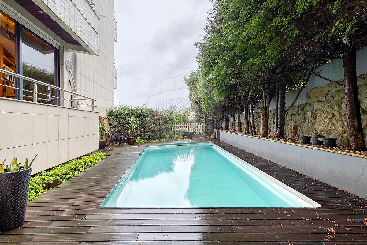A sala, ampla e luminosa, beneficia de varandas com vista rio e acesso direto à piscina, ideal para momentos de lazer e convívio. O jardim e a piscina são totalmente privativos, complementados por um anexo de apoio e entrada independente pelo jardim, garantindo privacidade e exclusividade.