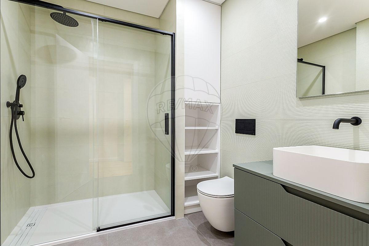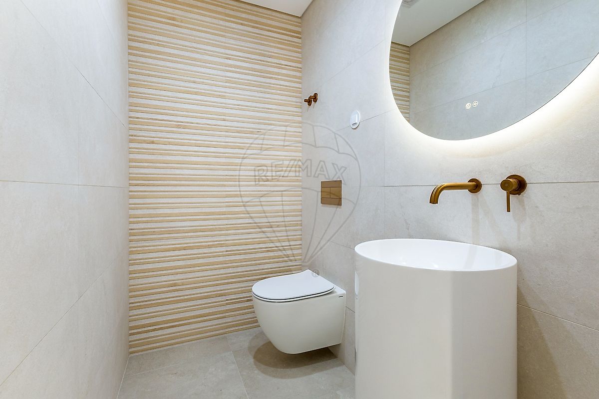 Casas de Banho de Design: Três ambientes de banho distintos, com revestimentos premium, louças suspensas e detalhes em preto mate e bronze.