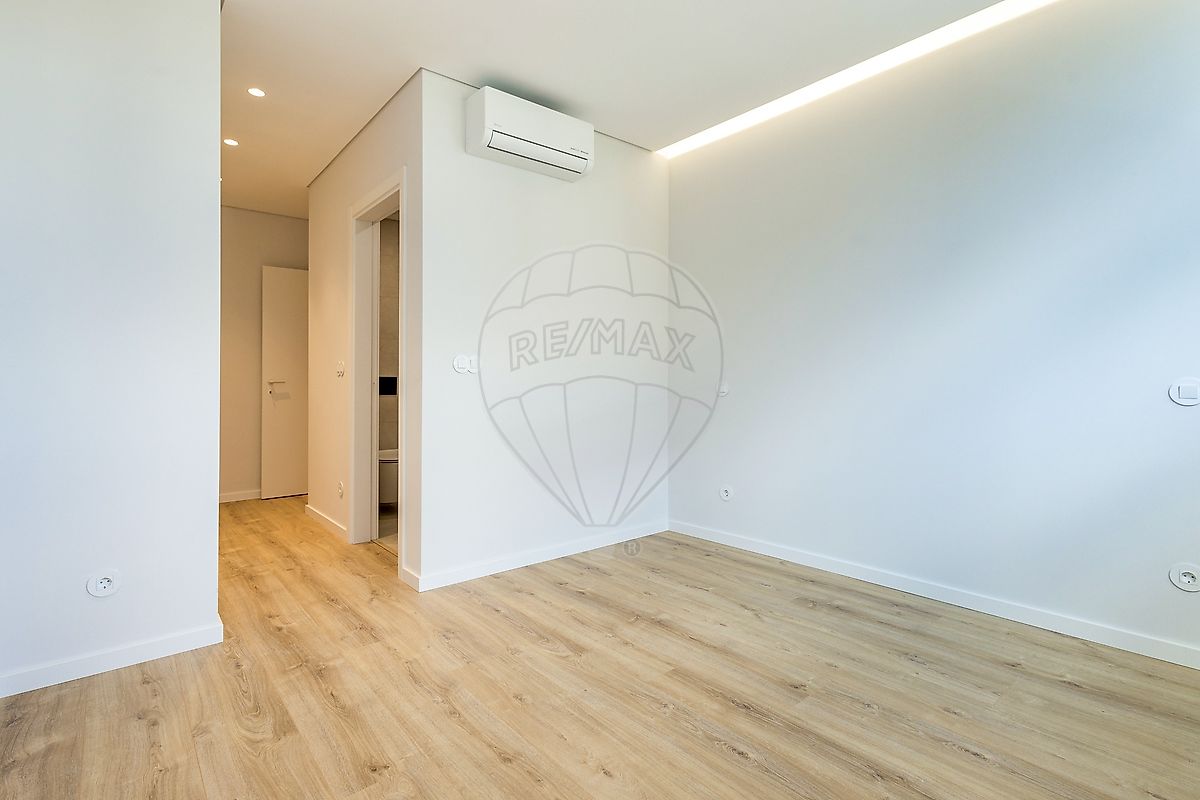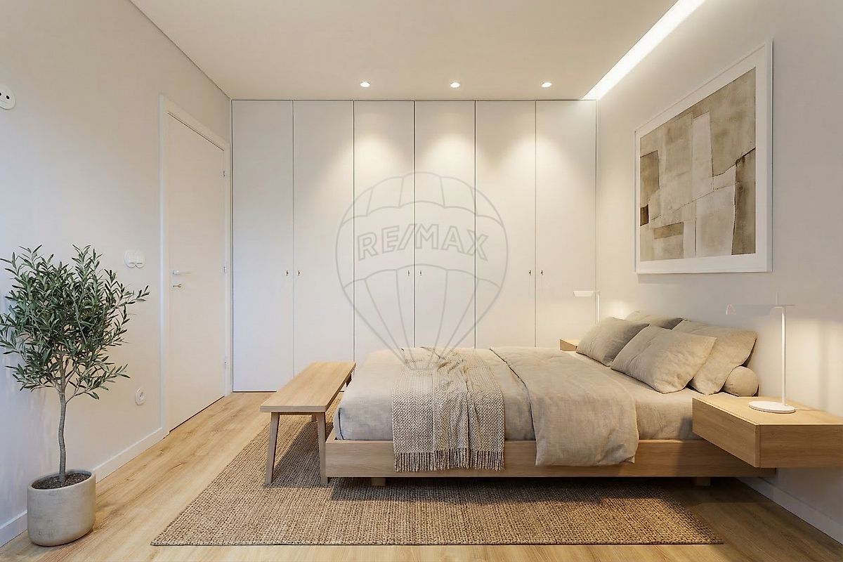 Suítes e Quartos: Quartos espaçosos com roupeiros embutidos de design minimalista, lacados a branco, oferecendo soluções de arrumação otimizadas.