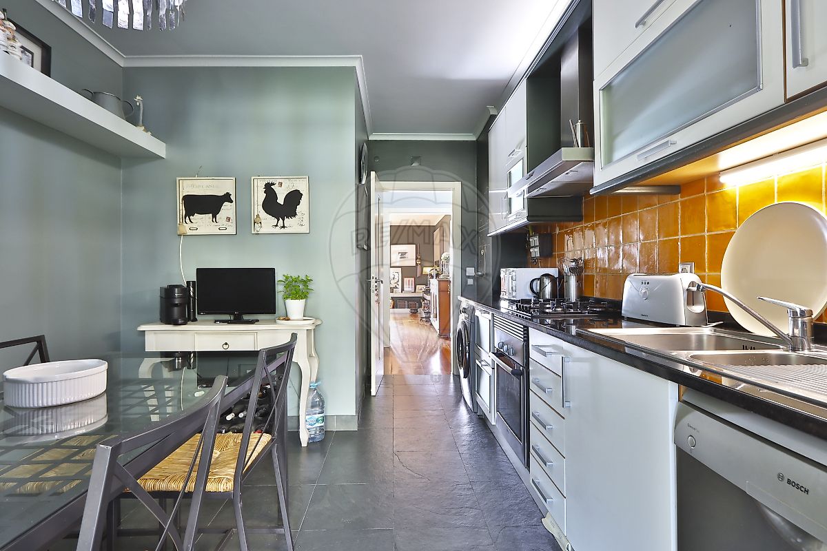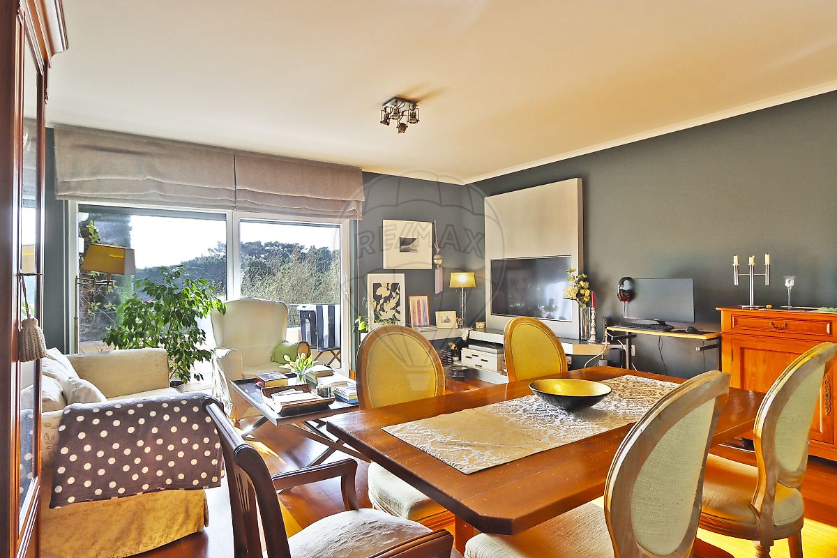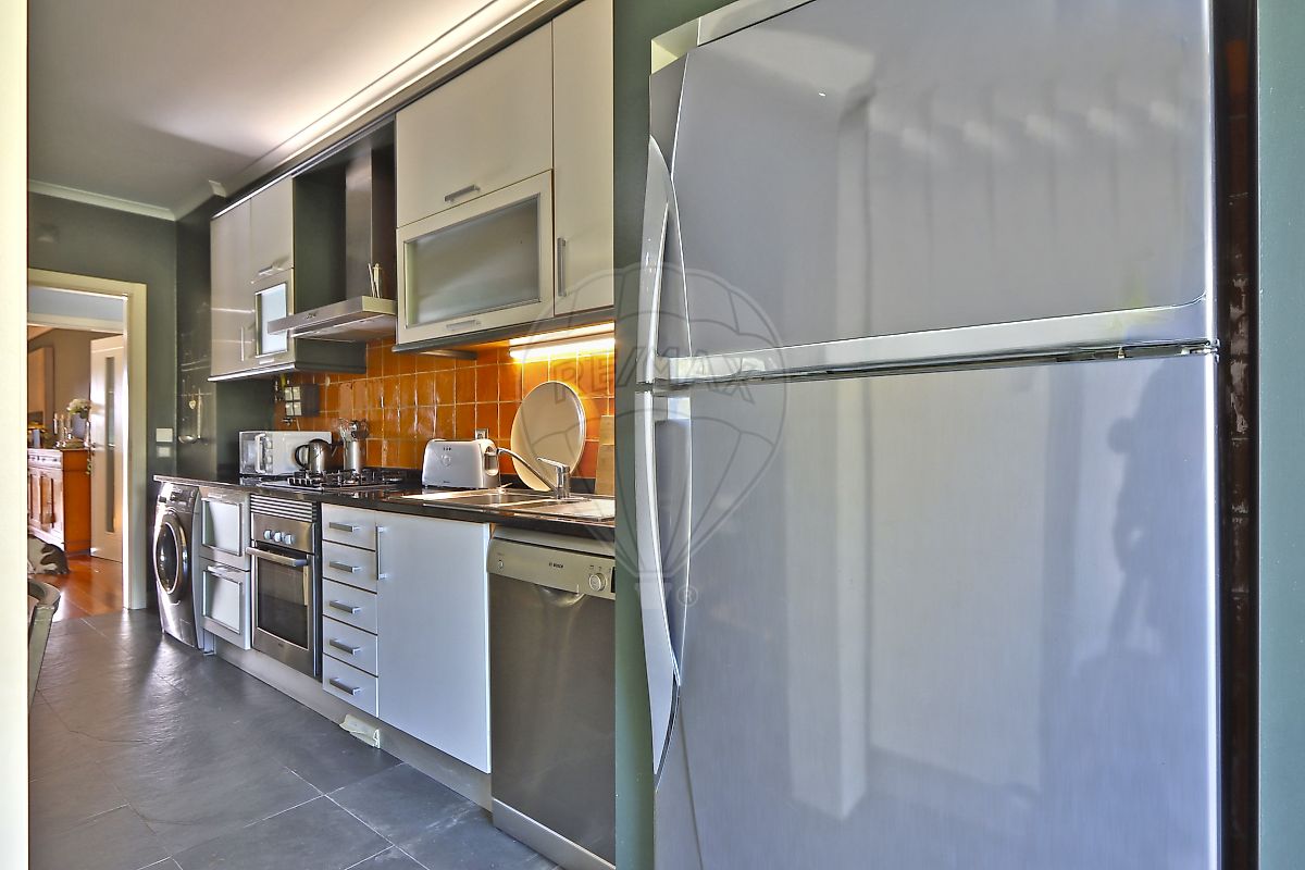 Apartamento dispõe de hall com roupeiro embutido, 2 quartos, 2 casas de banho, ampla sala de 30 m2 com varanda e vista para o jardim e para a Serra de Sintra, além de conter cozinha com excelentes áreas totalmente equipada.