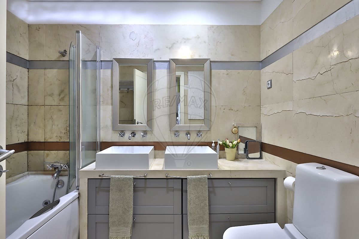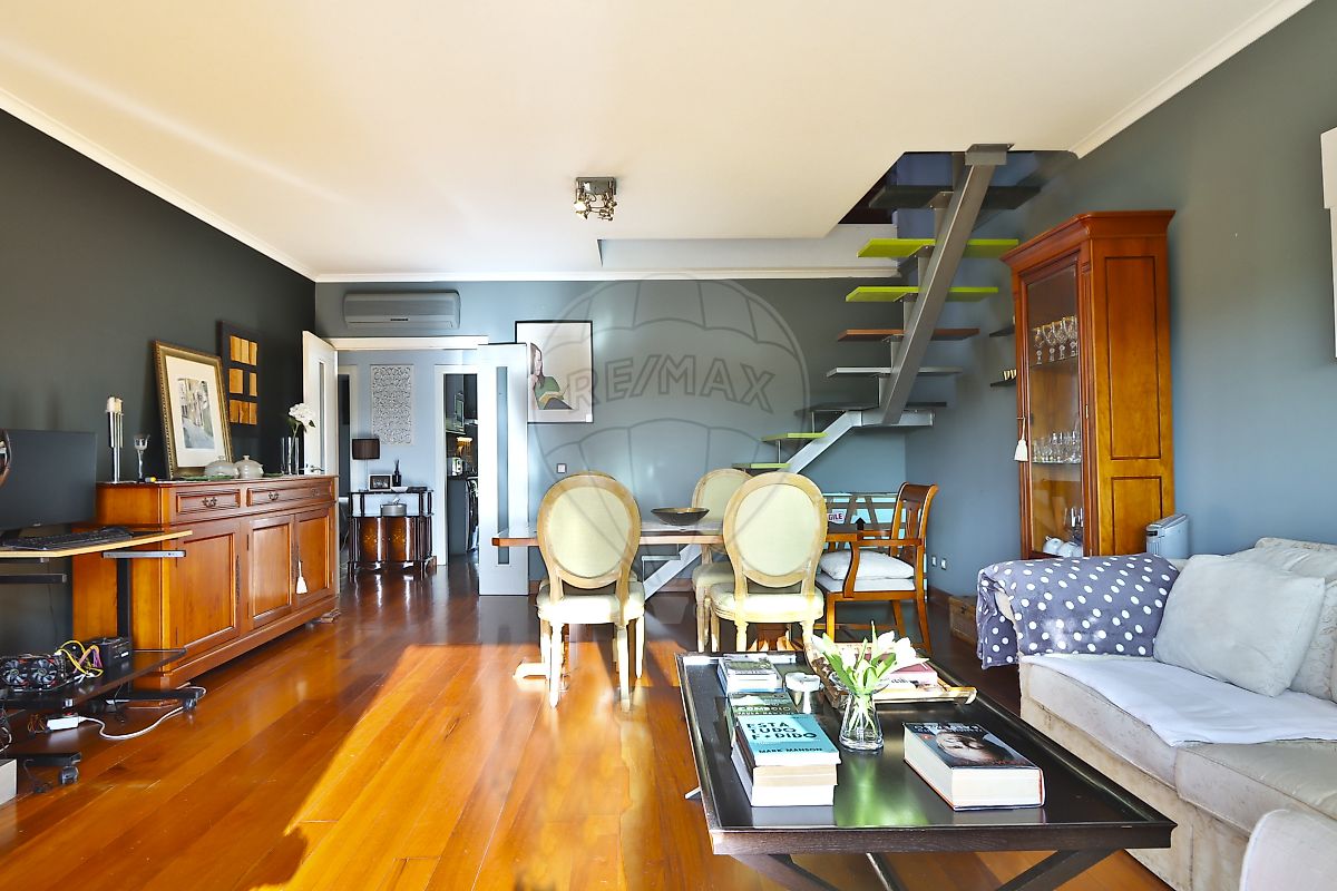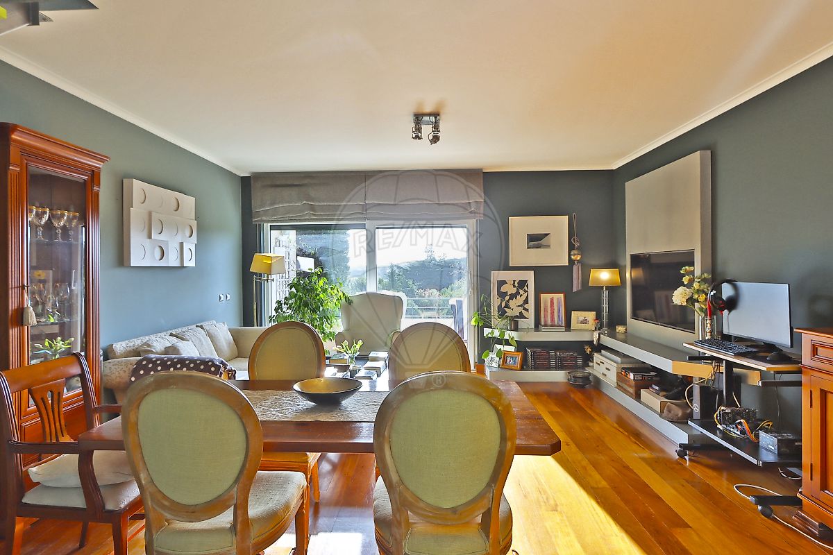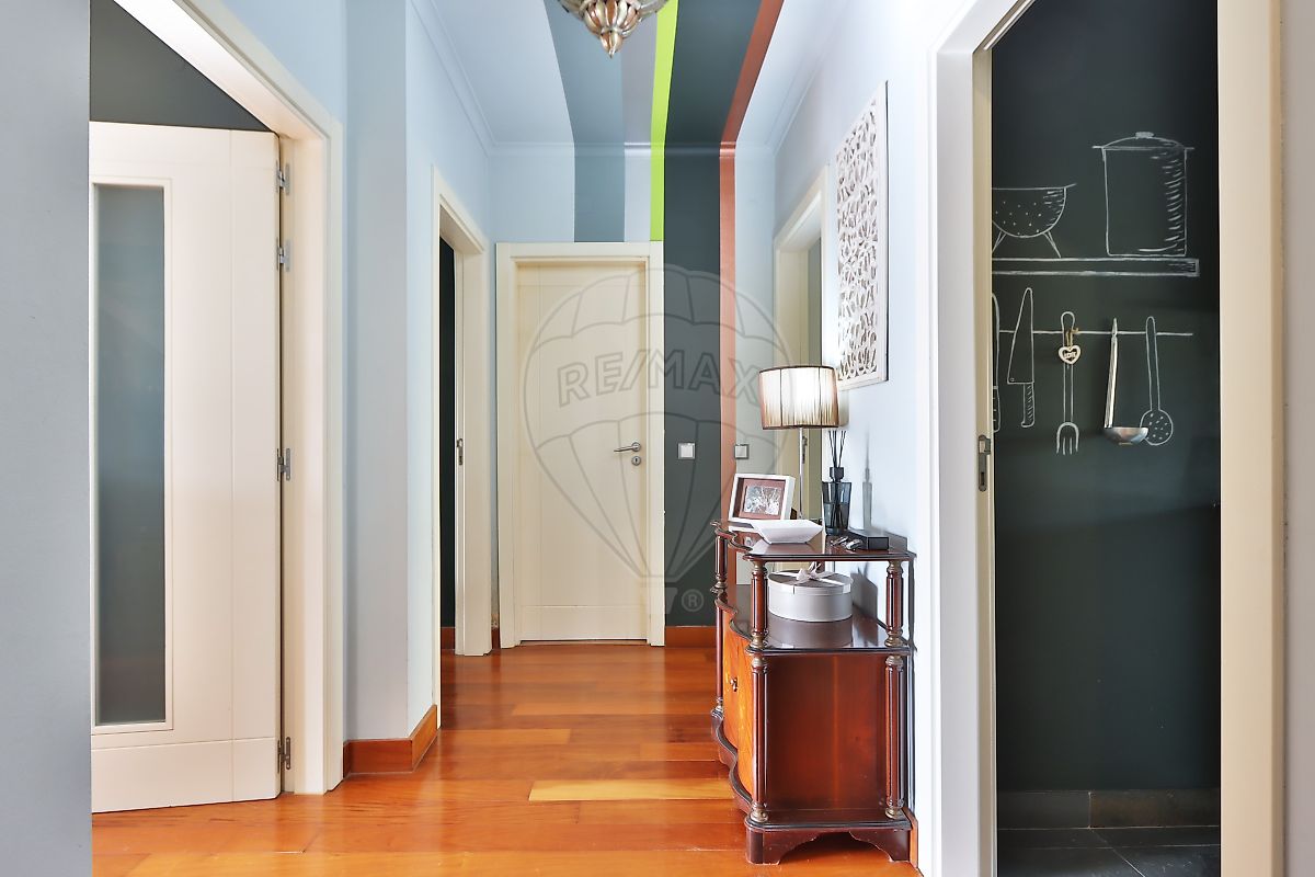 Apartamento dispõe de hall com roupeiro embutido, 2 quartos, 2 casas de banho, ampla sala de 30 m2 com varanda e vista para o jardim e para a Serra de Sintra, além de conter cozinha com excelentes áreas totalmente equipada.