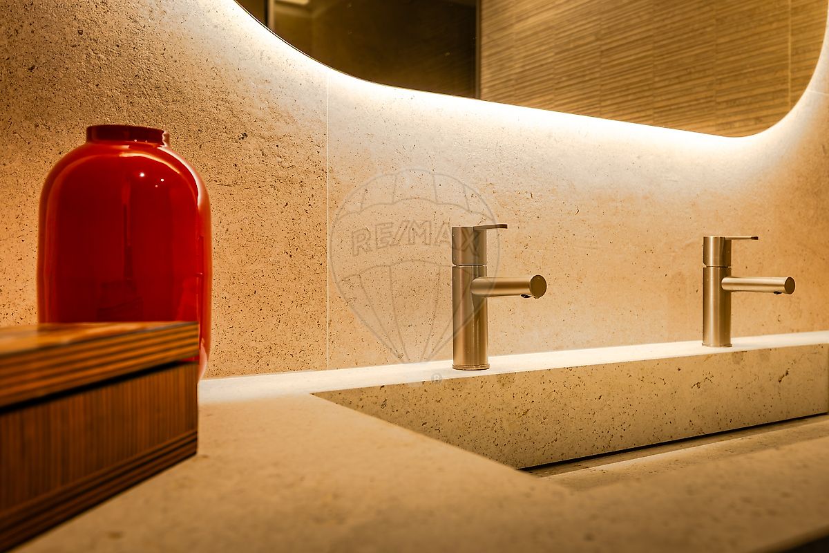 pavimento em cerâmica Porcelanosa, torneiras Bruma em inox, estores elétricos