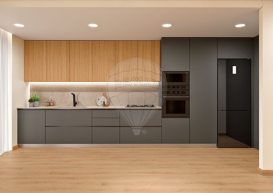 Pavimento flutuante no interior das frações de elevada durabilidade, em tom carvalho. Carpintarias (portas interiores, armários e roupeiros) em tons de carvalho americano. Sistema de AQS por bomba de calor.