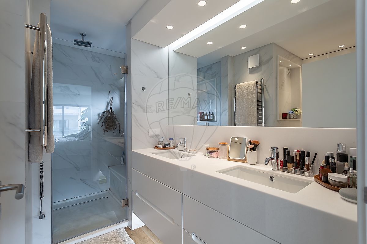 A master suite destaca-se pela sua dimensão excecional, pela porta invisível que garante continuidade visual, por uma ampla zona de roupeiros e por um walk-in closet de grandes dimensões, complementado por uma casa de banho elegante e contemporânea. Um dos quartos dispõe ainda de varanda, reforçando a ligação ao exterior e a entrada de luz natural.