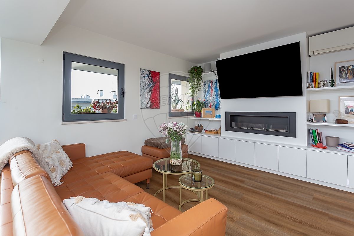 A sala, ampla e luminosa, conta com lareira e prolonga-se naturalmente para o grande destaque da casa: um terraço exclusivo no topo do edifício, ideal para receber, relaxar ou simplesmente usufruir do exterior com total privacidade.