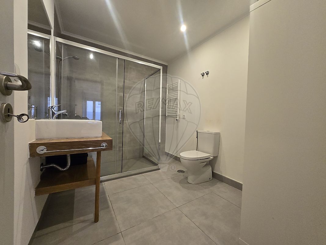 - instalação sanitária de apoio aos quartos (2,90m2) com sanita, lavatório com armário e base de duche