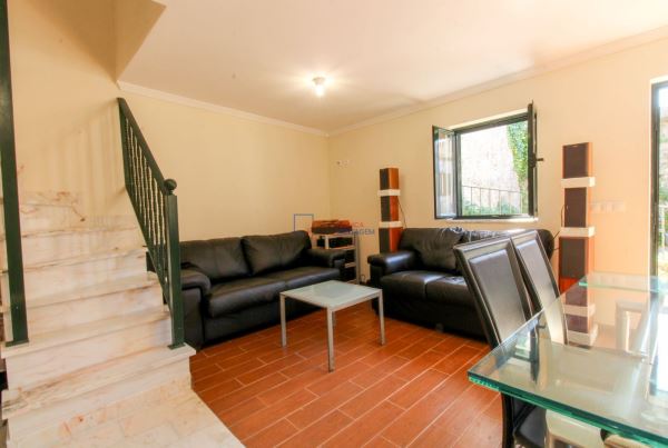 No piso térreo encontra uma sala e cozinha integradas, num ambiente luminoso e bem distribuído. A sala dispõe de sofás em pele, mesa de centro e mesa de refeições em vidro — tudo incluído na venda.