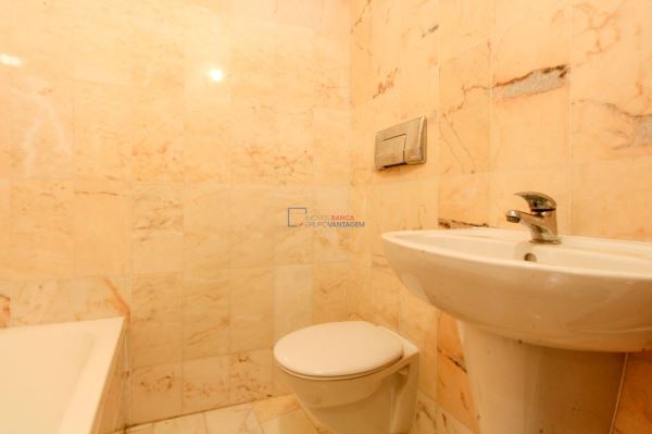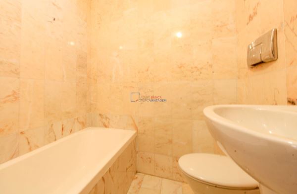 A casa de banho mantém a mesma linha prática e funcional, com revestimento marmoreado, banheira com chuveiro e loiças sanitárias em bom estado.