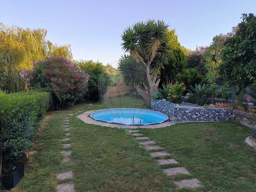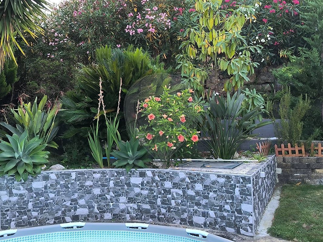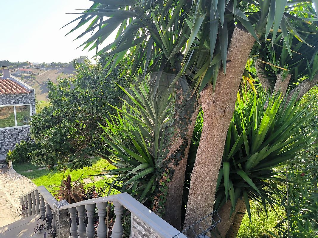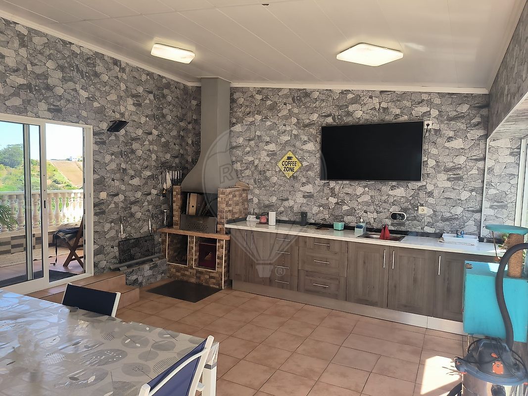 No exterior, encontra-se uma piscina com capacidade de 17m³ de água, jardim com diversas árvores de fruto, palmeiras e espaço amplo para cultivo de legumes — ideal para quem procura maior independência alimentar. A propriedade inclui também um poço com água natural potável e colmeias de abelhas.