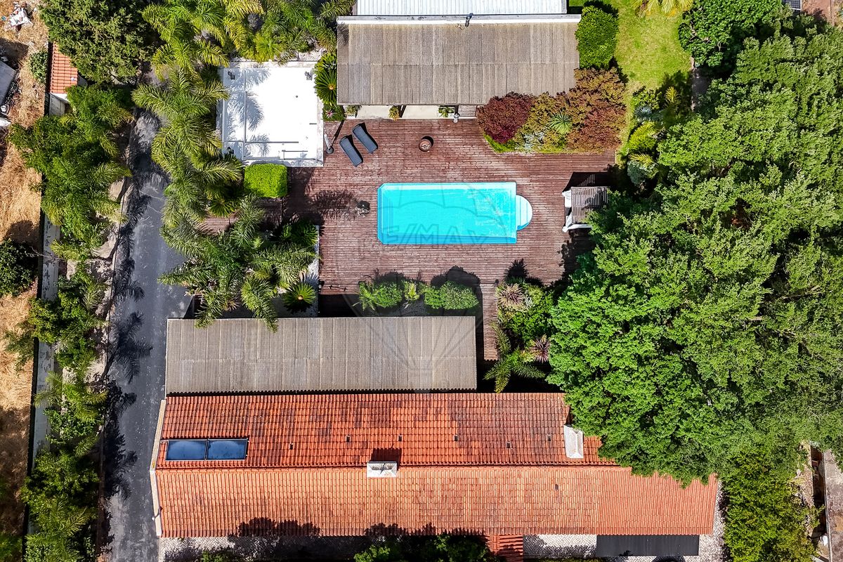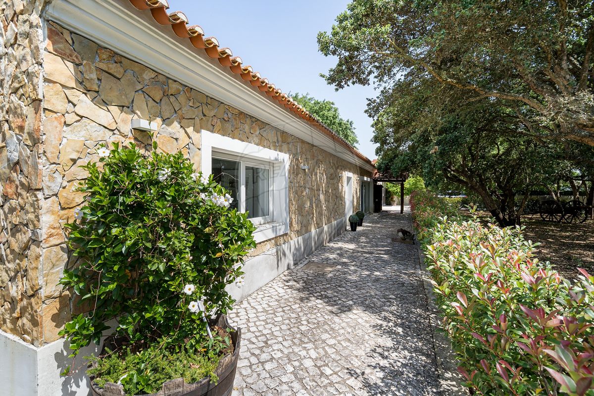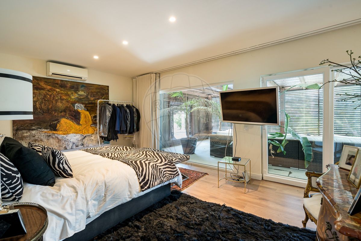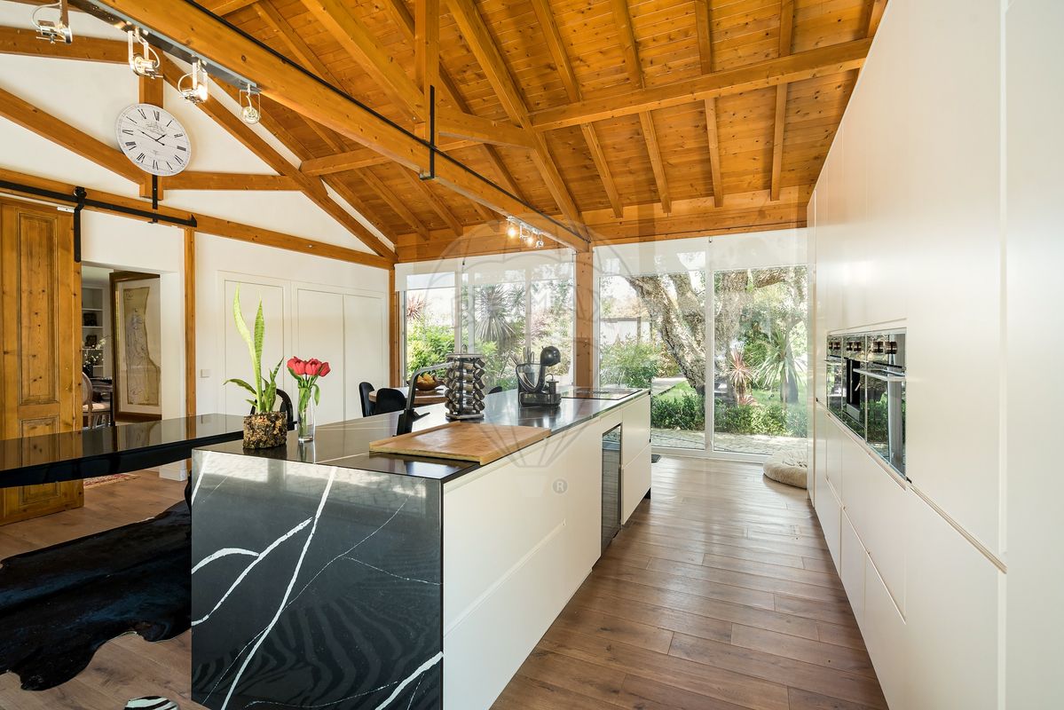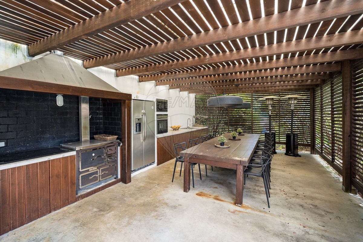 A residência principal surpreende pela arquitetura distinta e pelos seus elementos de caráter, como uma porta marroquina imponente e uma janela mexicana centenária, que se fundem harmoniosamente com linhas modernas e ambientes luminosos. No interior, os espaços são amplos e funcionais: cozinha totalmente equipada, a sala de estar e sala de jantar com vistas panorâmicas para o jardim e piscina, master suíte com closet, escritório (com possibilidade de se tornar quarto adicional) e acabamentos de qualidade como soalho em madeira, estores elétricos, caixilharia em PVC, ar condicionado e lareira.