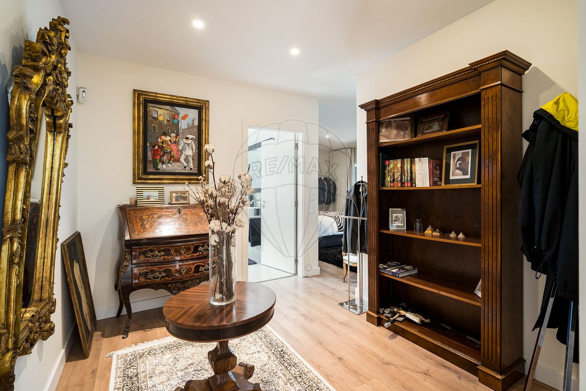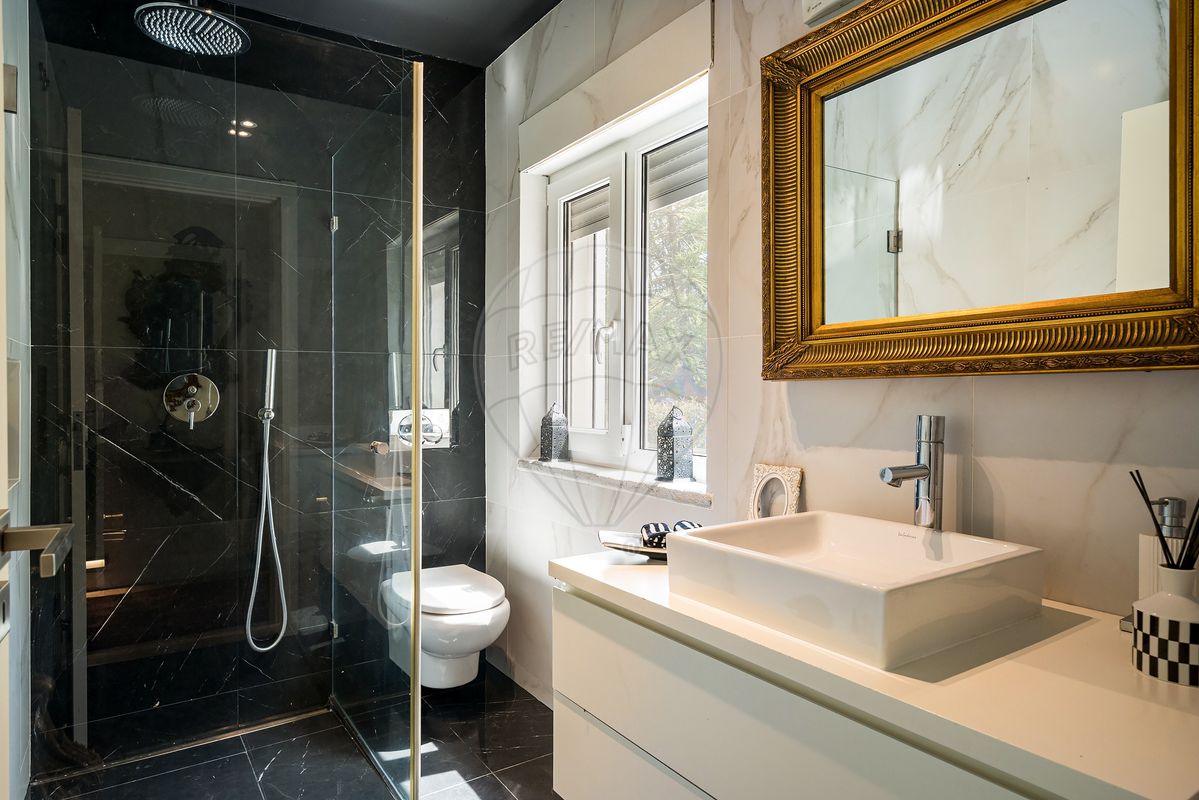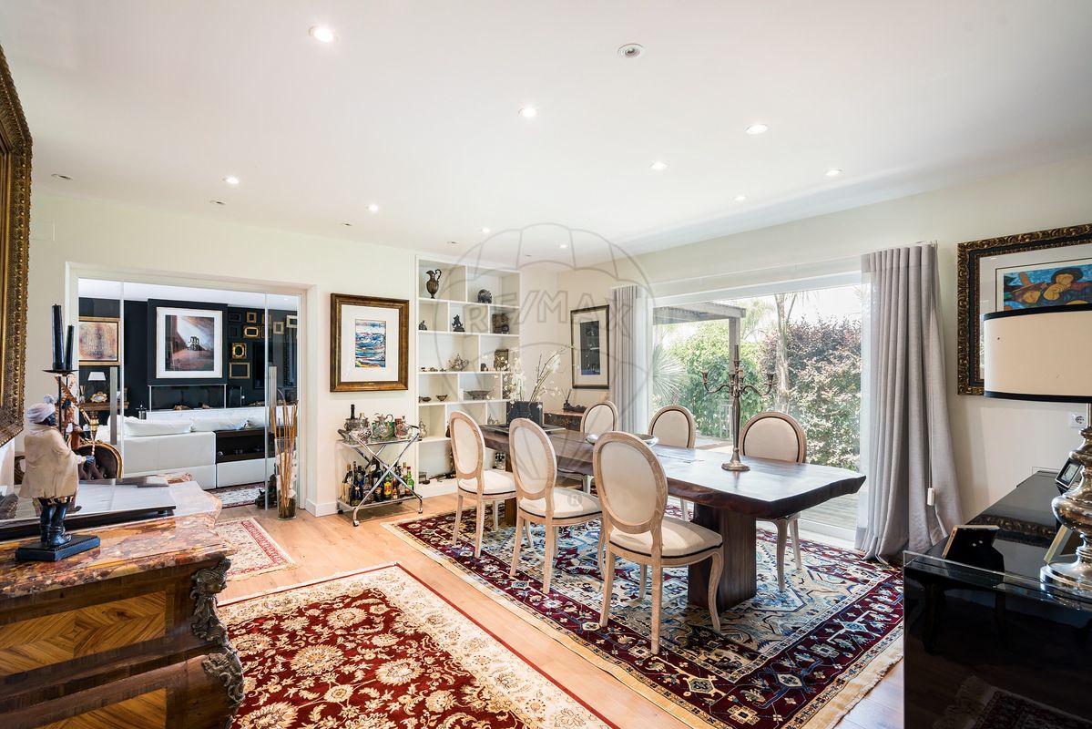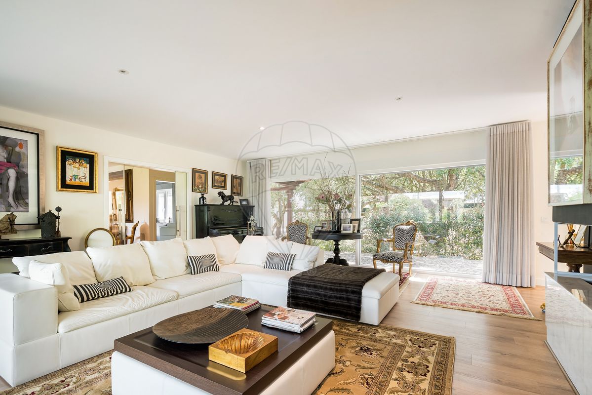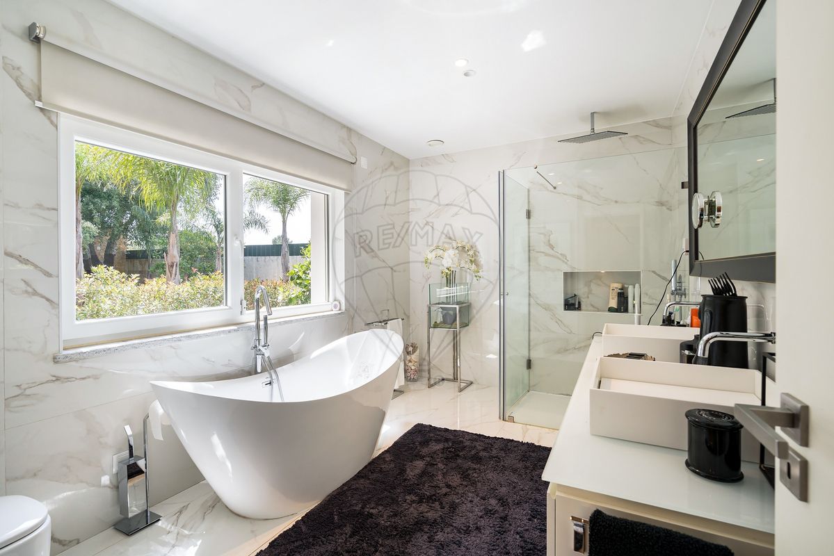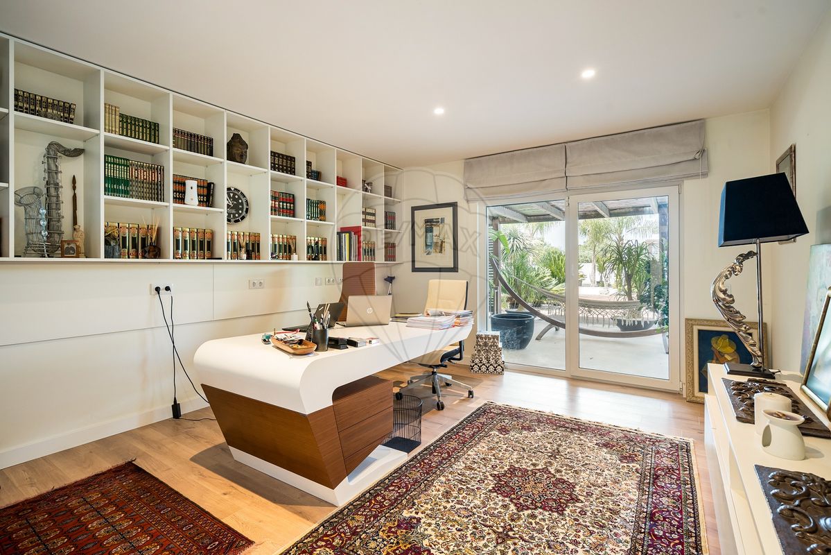 A residência principal surpreende pela arquitetura distinta e pelos seus elementos de caráter, como uma porta marroquina imponente e uma janela mexicana centenária, que se fundem harmoniosamente com linhas modernas e ambientes luminosos. No interior, os espaços são amplos e funcionais: cozinha totalmente equipada, a sala de estar e sala de jantar com vistas panorâmicas para o jardim e piscina, master suíte com closet, escritório (com possibilidade de se tornar quarto adicional) e acabamentos de qualidade como soalho em madeira, estores elétricos, caixilharia em PVC, ar condicionado e lareira.