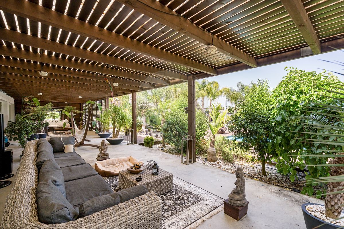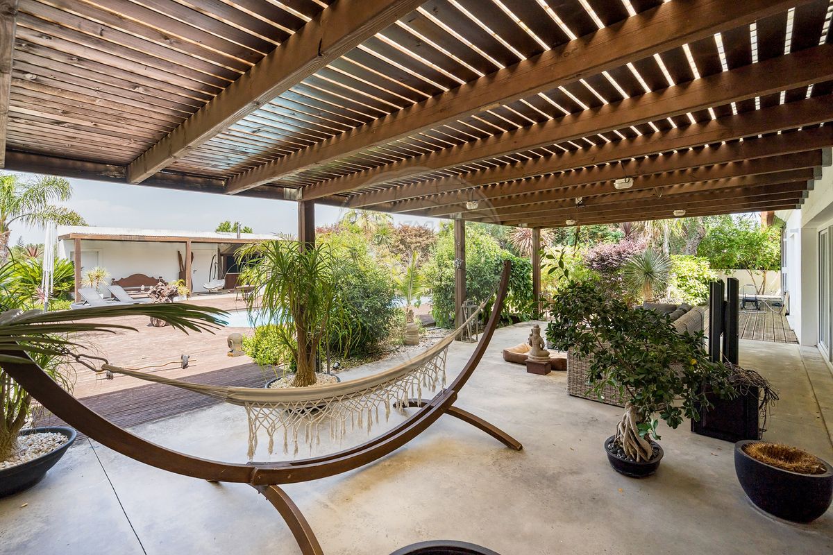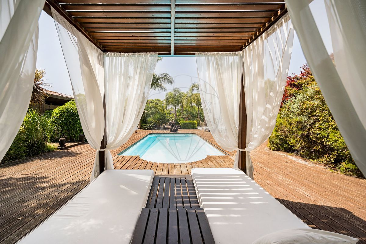 The main residence stands out for its distinctive architecture and unique character, featuring an imposing Moroccan door and a 200-year-old Mexican window, harmoniously blending with modern lines and bright interiors. Inside, the spaces are spacious and functional: a fully equipped kitchen, living and dining rooms with panoramic views over the garden and pool, a master suite with walk-in closet, an office (which can be converted into an additional bedroom), and quality finishes such as wooden flooring, electric shutters, PVC frames, air conditioning, and fireplace.