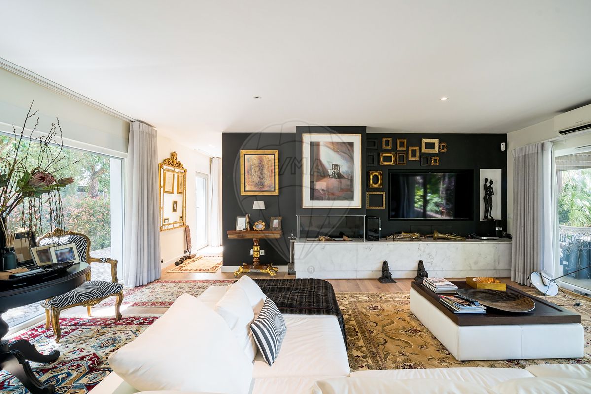 Outdoors, the property evokes the atmosphere of a private resort: two swimming pools surrounded by a natural wood deck, an outdoor jacuzzi along an orange-tree path, lush landscaped gardens, a private gym, and a 50 m² gourmet area fully equipped to entertain family and friends. The estate also includes a spacious garage, additional parking, and a second independent residence of 50 m² – perfect for guests, staff, or rental income.
