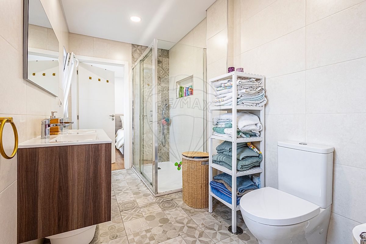 No primeiro piso, a moradia dispõe de dois quartos em suite, ambos com ligação à mesma casa de banho completa, garantindo conforto e organização. Os quartos estão equipados com ar condicionado e as laterais do piso contam com zonas de arrumação inteligente, otimizando o espaço disponível.