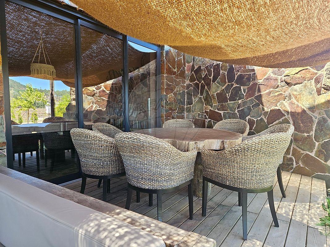 suites, sala com lareira e cozinha integrada e uma vista única para a albufeira de Castelo de Bode. Conta também com um terraço, alpendre e piscina para que possa usufruir da