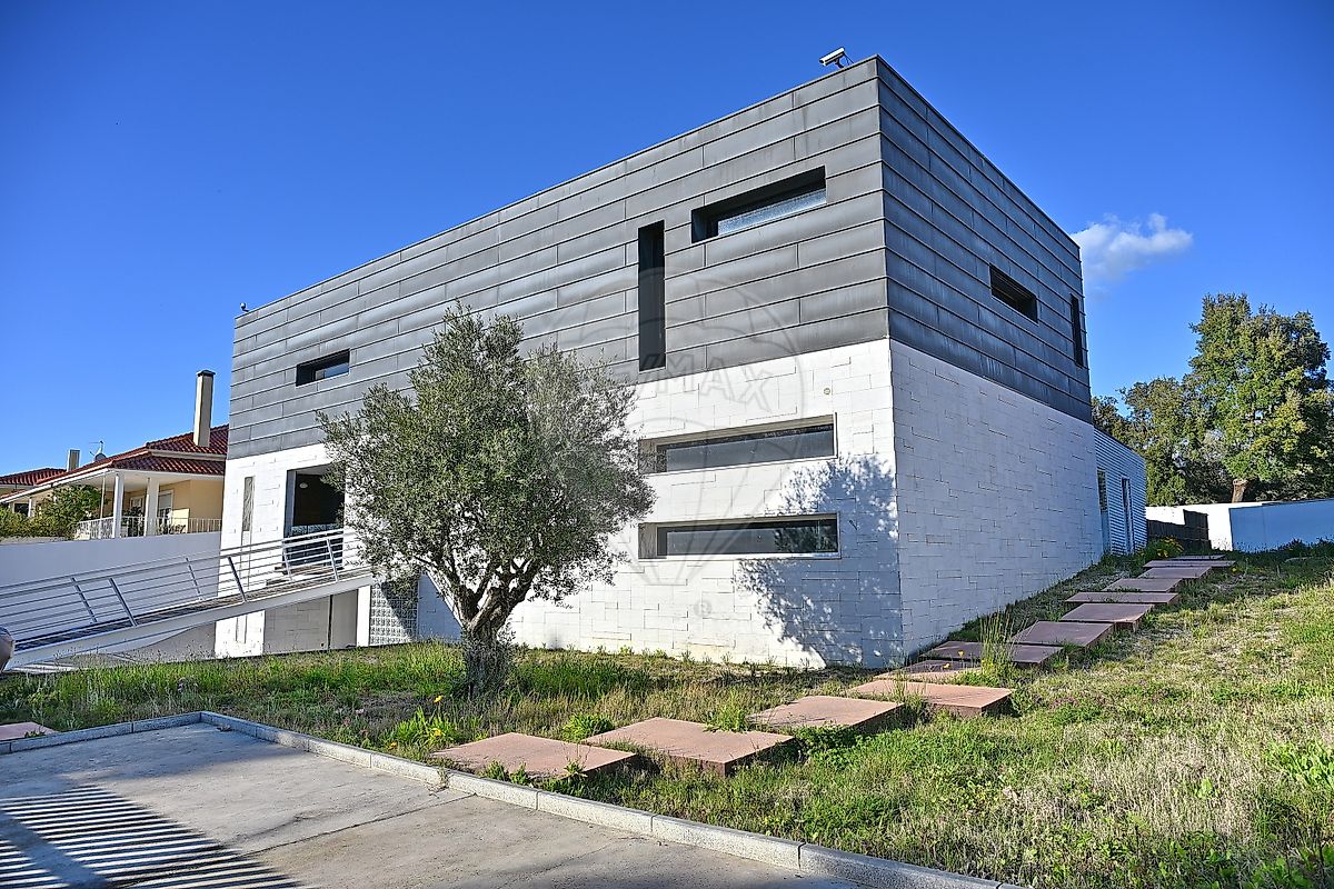 O Revestimento exterior é em zinco na parte superior e pedra na parte inferior, conferindo um estilo moderno e sofisticado.