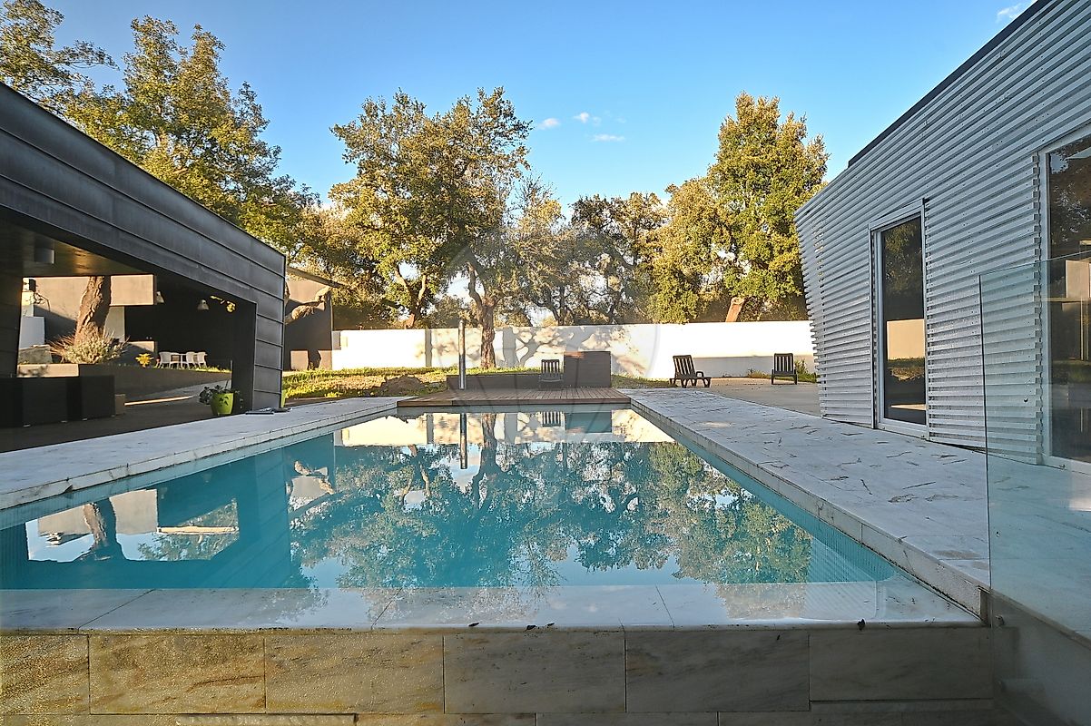 - Piscina com cascata. Mas não só. Se uma piscina não bastasse e uma cascata para dar aquele cenário de ouvir a água a cair, esta moradia conta ainda, no piso inferior, com uma mini piscina com motor de simulação de ondas, criando um ambiente de spa exclusivo. Já pensou nisto?!