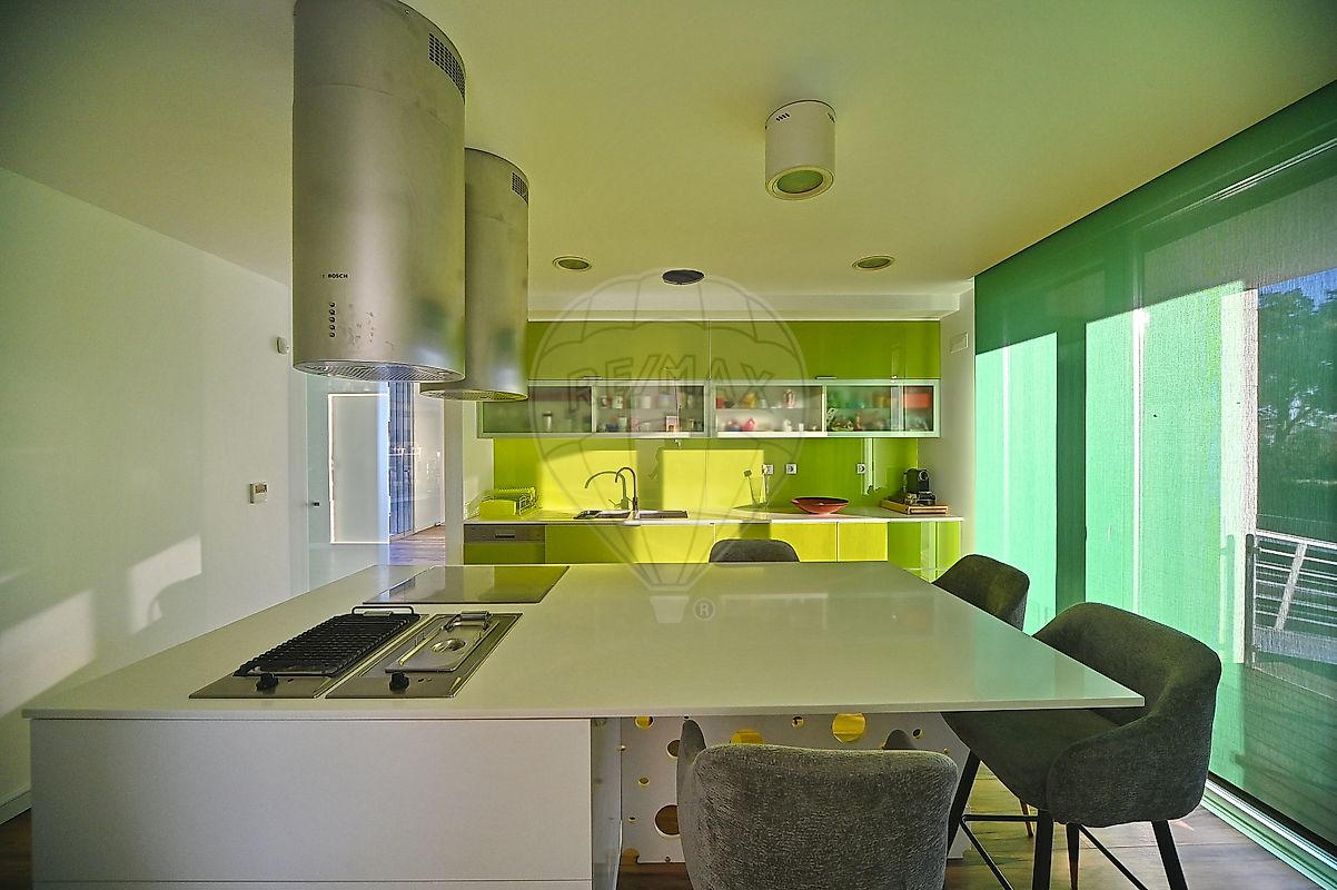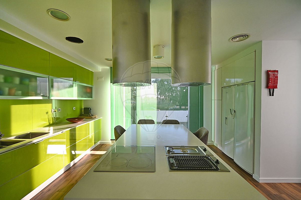 - Cozinha moderna e funcional, equipada com frigorífico, máquina de lavar loiça, forno, micro-ondas, gaveta de aquecimento, fritadeira, placa e grelhador elétrico embutidos na ilha central.