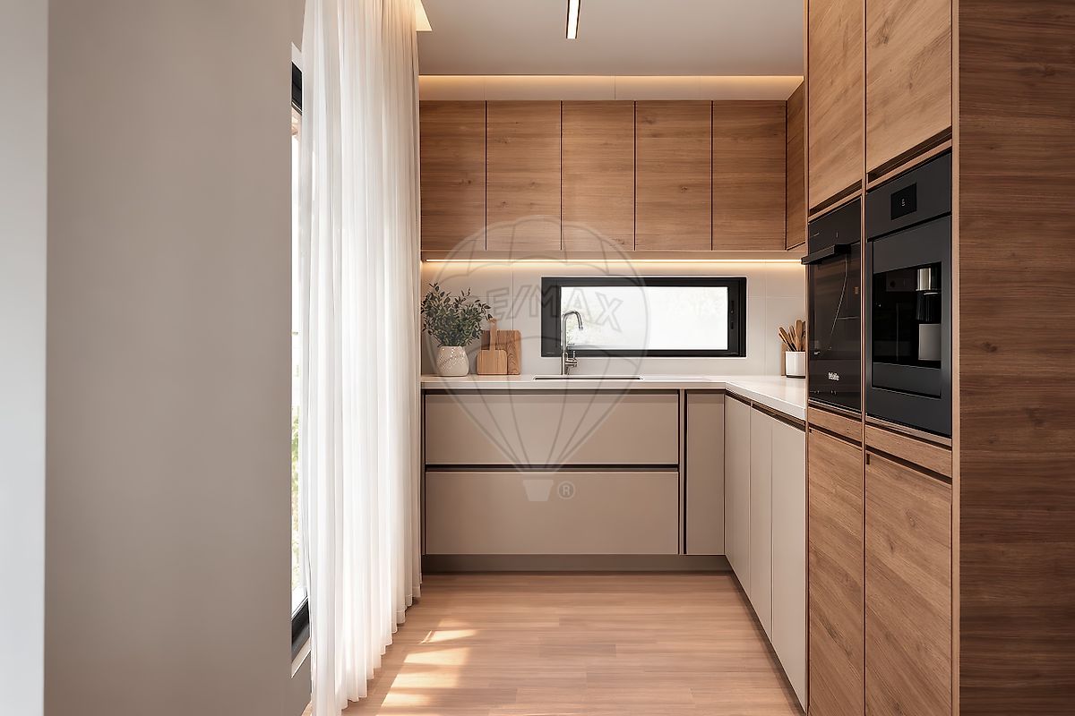 A cozinha apresenta um design contemporâneo e encontra-se totalmente equipada com eletrodomésticos de qualidade superior, incluindo placa, forno, exaustor, máquina de lavar loiça e combinado. Este piso conta ainda com uma zona de lavandaria independente e um WC de serviço.