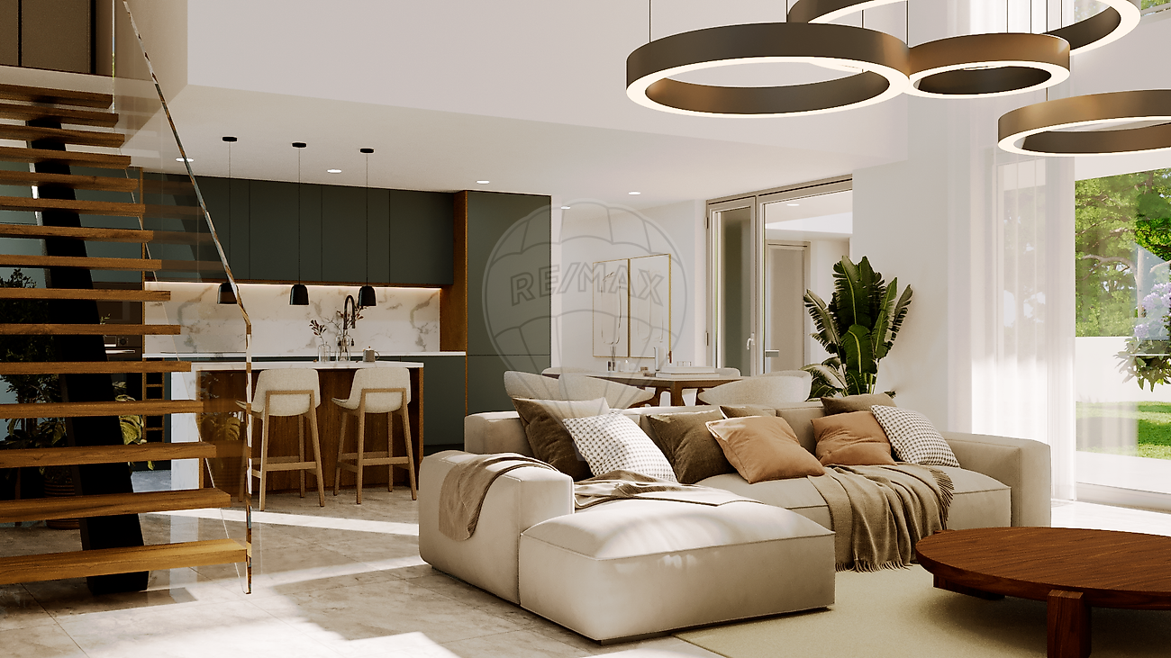A entrada conduz diretamente à zona social em open space, onde sala e cozinha se articulam sob um pé-direito duplo, potenciando a entrada de luz natural e a sensação de amplitude. A cozinha, em verde mate com apontamentos dourados, encontra-se totalmente equipada, com ilha, Silestone e preparação side-by-side para frigorífico e congelador. Neste piso, a casa dispõe ainda de lavandaria e despensa invisíveis, três quartos amplos com roupeiros e um WC social completo com sanitas inteligentes.