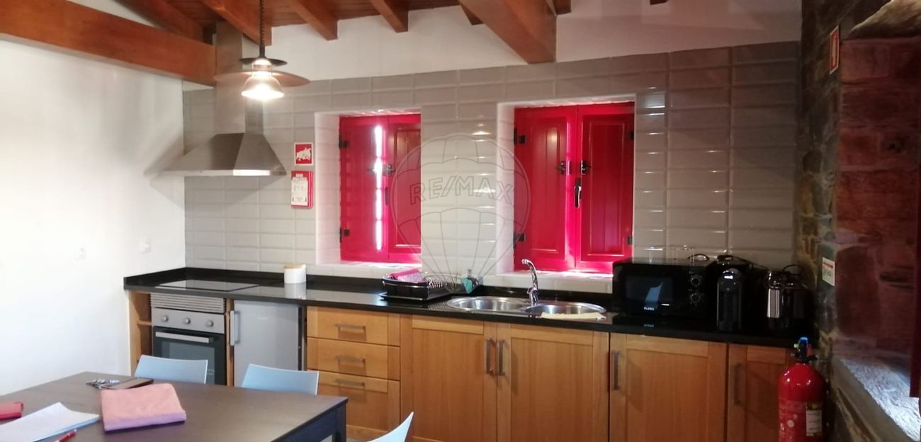 Paredes em pedra de xisto, interiores em madeiras nobres de castanho, pinho e carvalho.