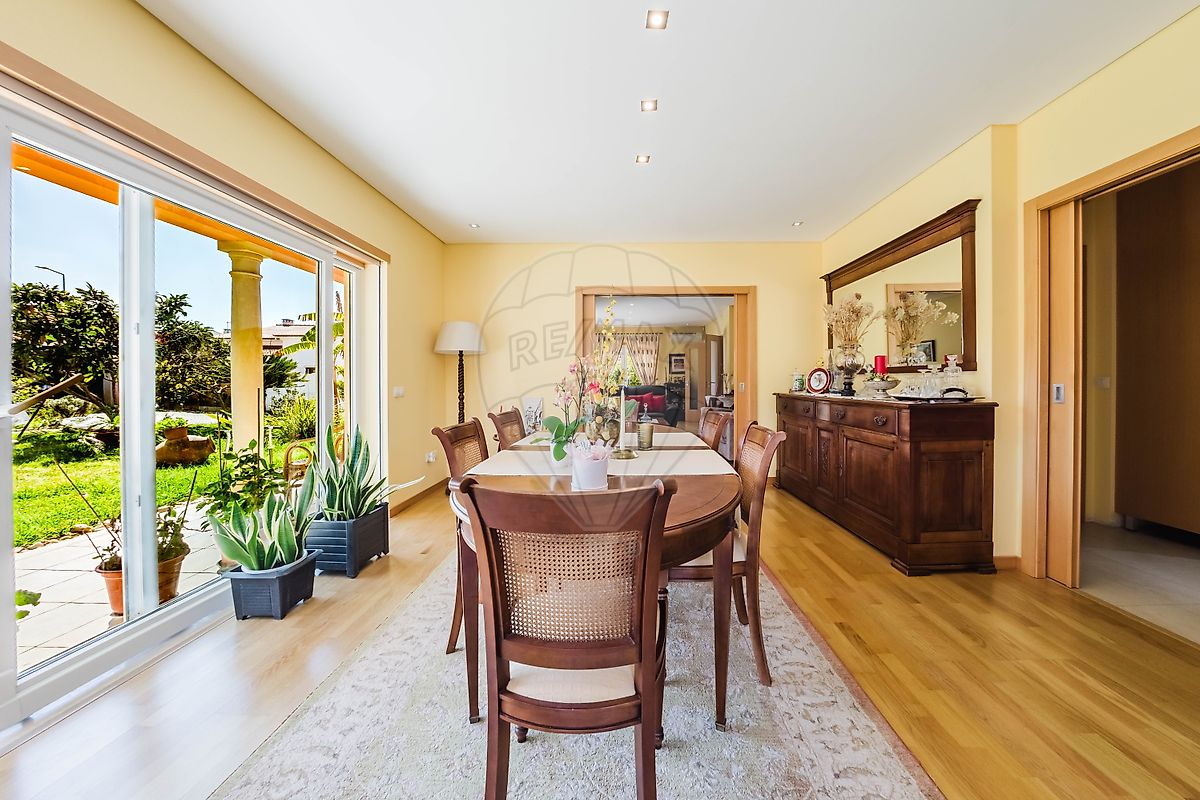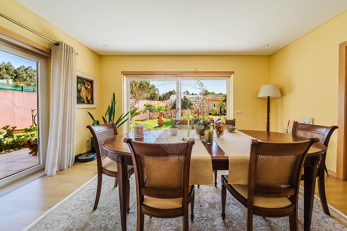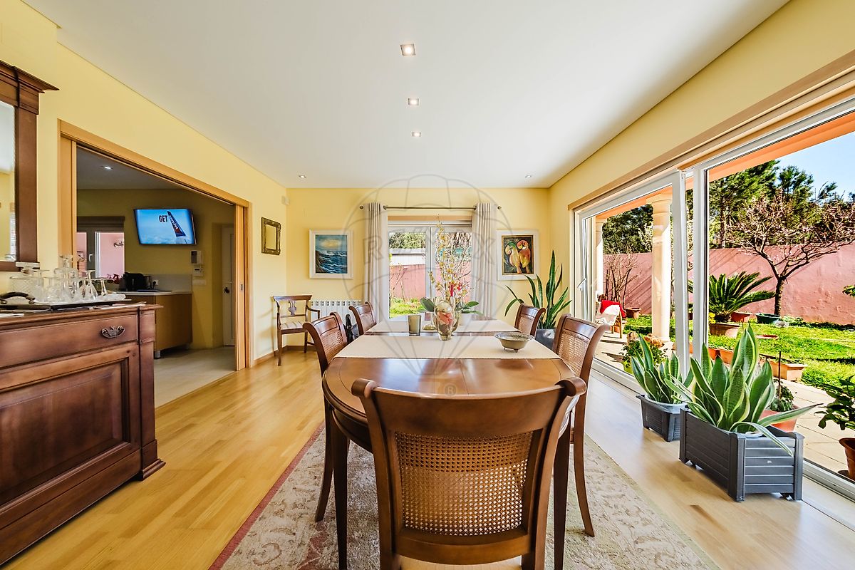 A zona social prolonga-se para uma elegante sala de jantar, um espaço pensado para partilhar momentos especiais à mesa. Tal como a sala principal, esta divisão destaca-se pela abundante luminosidade natural, graças às amplas janelas que permitem que a luz natural percorra toda a área social da casa, criando um ambiente leve, harmonioso e extremamente convidativo.