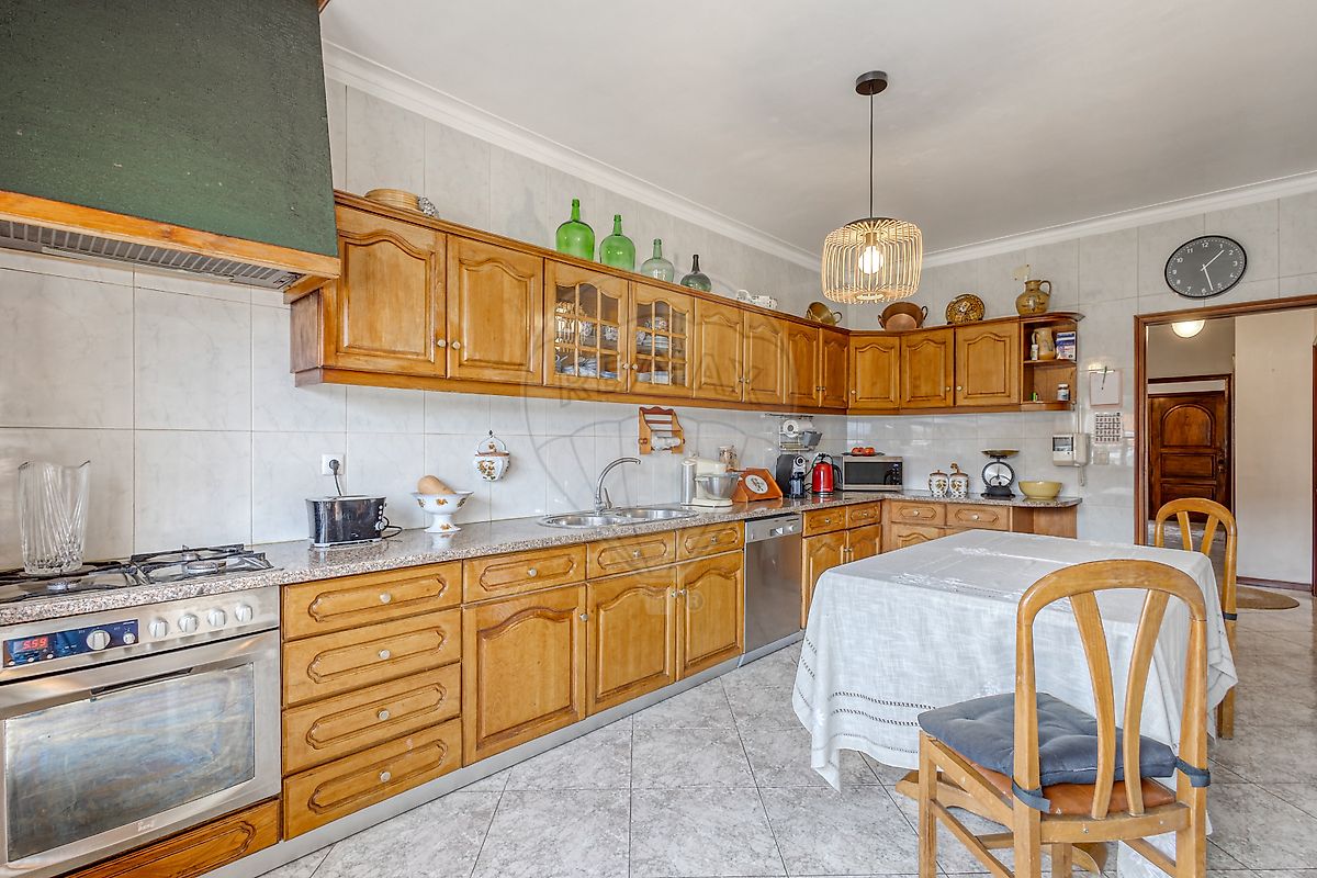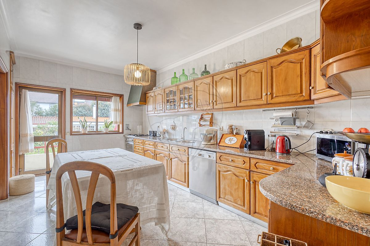 A cozinha encontra-se totalmente equipada e dispõe de acesso direto ao jardim, ideal para momentos de lazer e convívio ao ar livre.