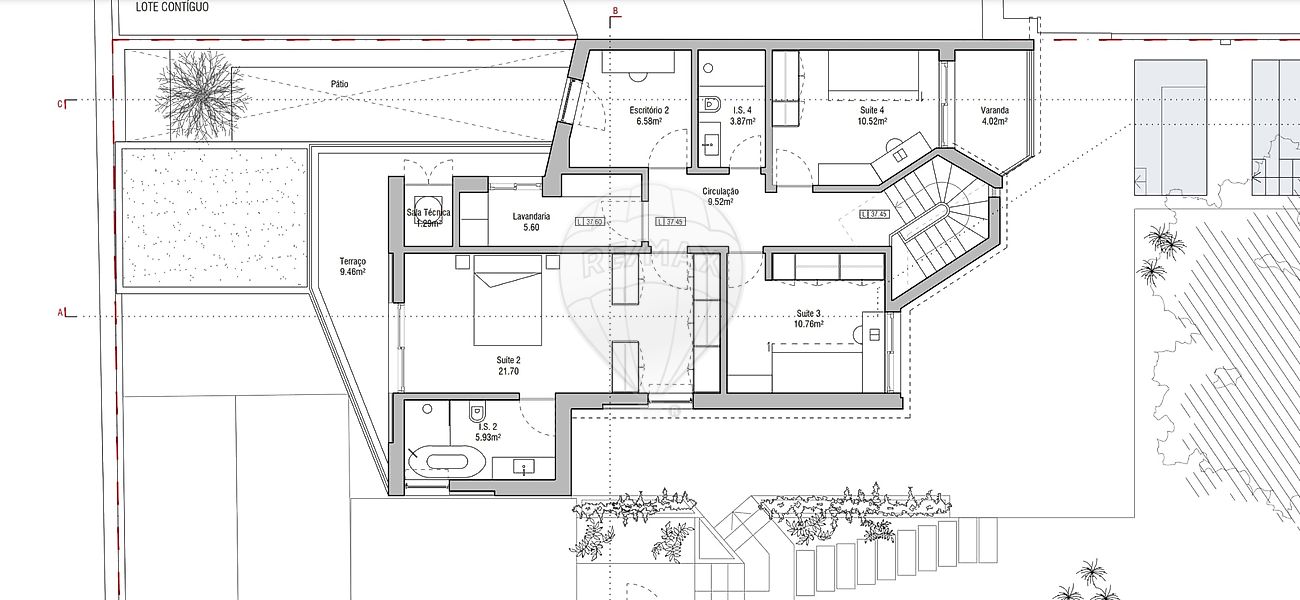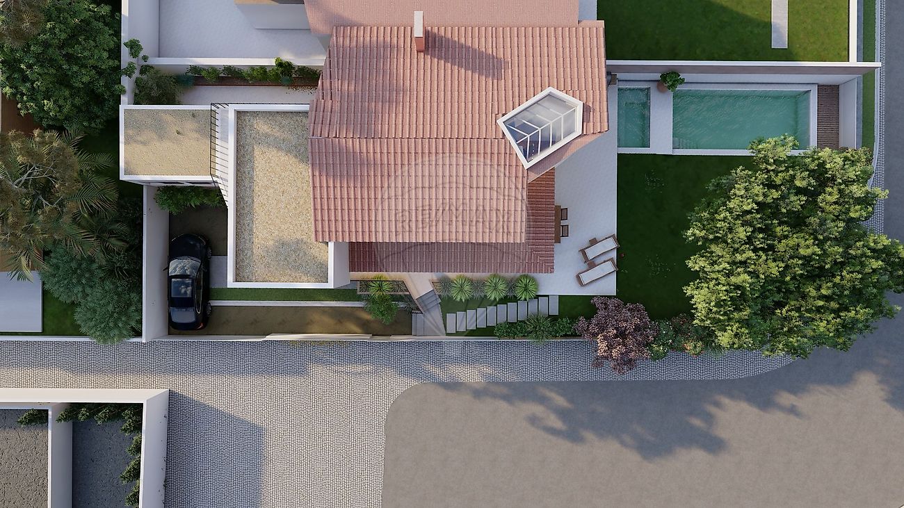 Implantada num lote de gaveto com 425 m², esta propriedade beneficia de uma excelente exposição solar nascente/poente, proporcionando ambientes naturalmente luminosos e acolhedores ao longo de todo o dia.