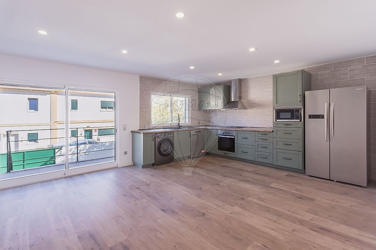 A cozinha encontra-se totalmente equipada, incluindo frigorífico americano de duas portas, máquina de lavar roupa, placa e forno elétricos, exaustor, máquina de lavar louça e micro-ondas.