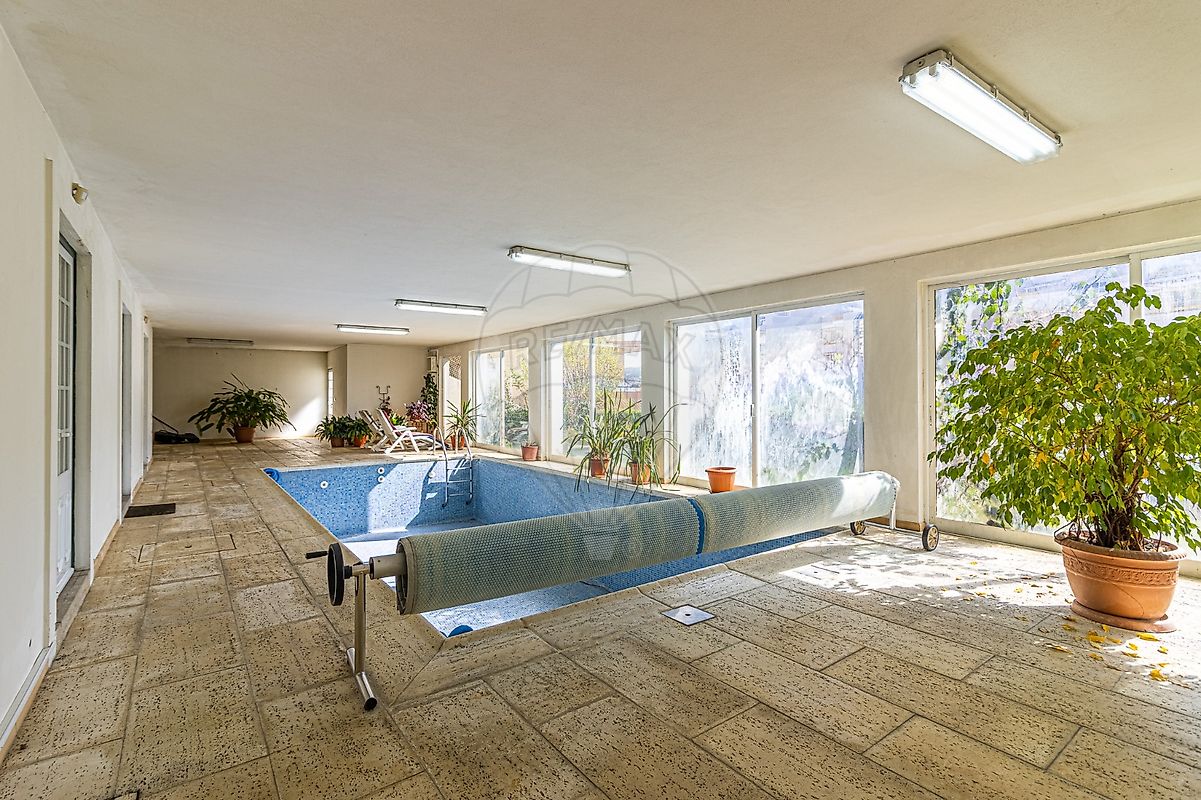 Do salão, temos acesso direto à zona da piscina interior, com chuveiro, outra casa de banho completa, mais 2 divisões de arrumos e a sala das máquinas.