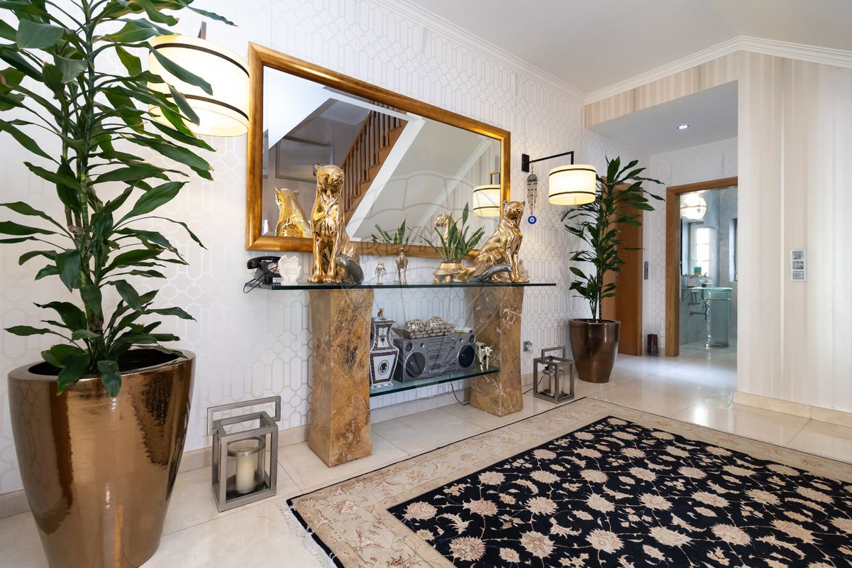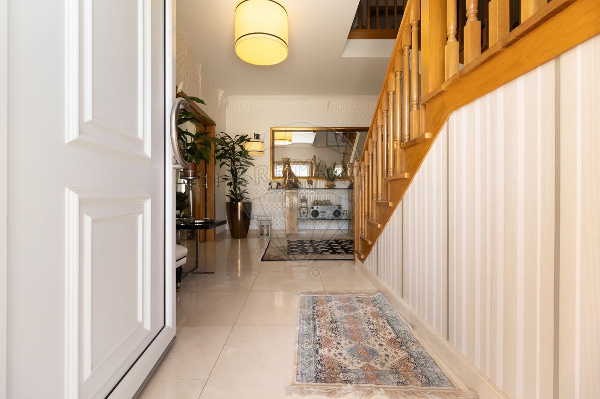 - No seu piso terreo, encontramos um enorme hall onde o chão em "Moka creme", originário de um só filão de pedra natural e, o papel de parede, foram escolhidos ao pormenor.
