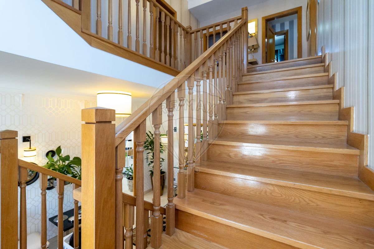 - As escadas são em Carvalho Americano, bem como, todo o chão do Segundo e terceiro pisos.